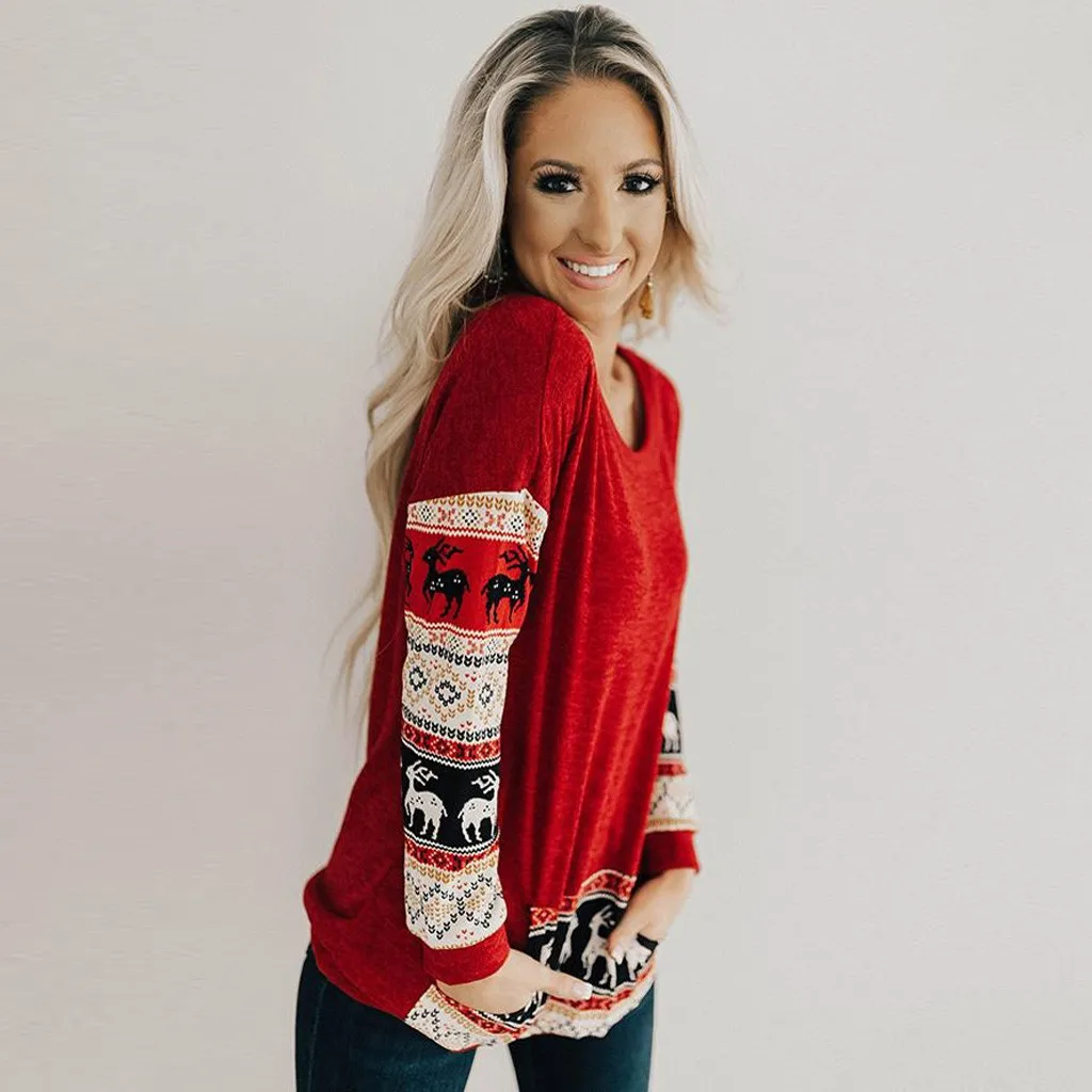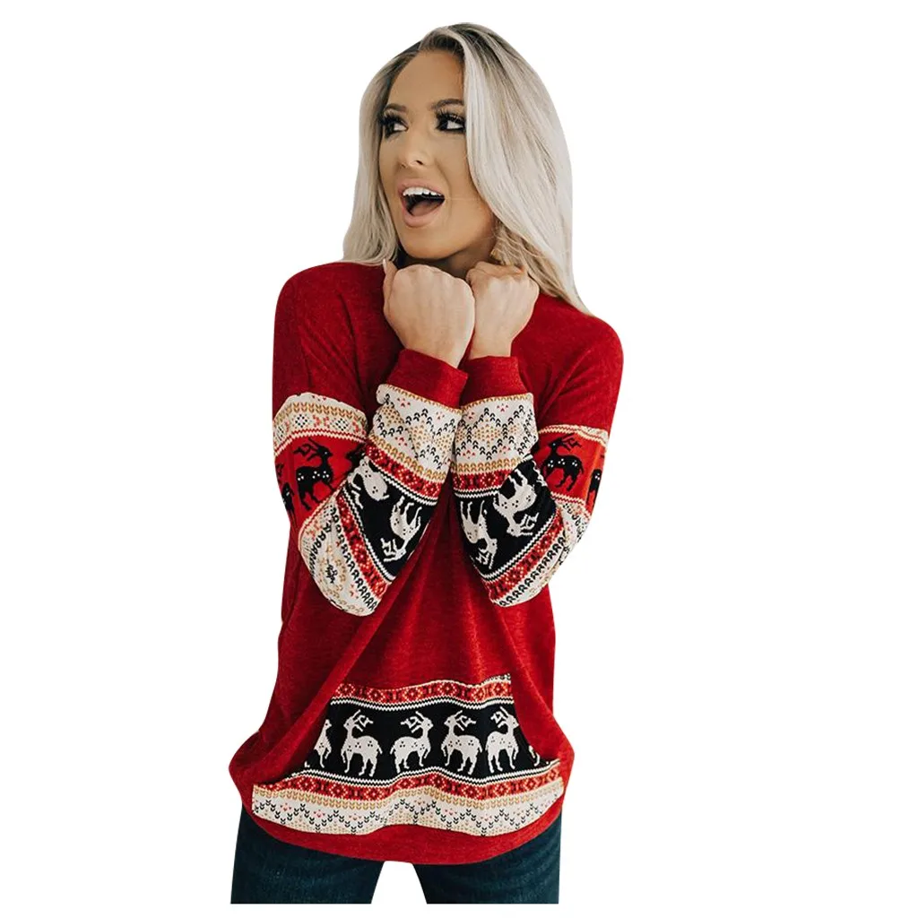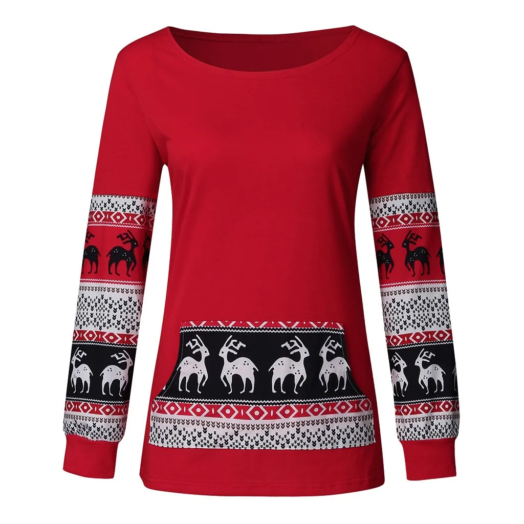 Женский Рождественский красный свитер с принтом и карманом, топы, блузки