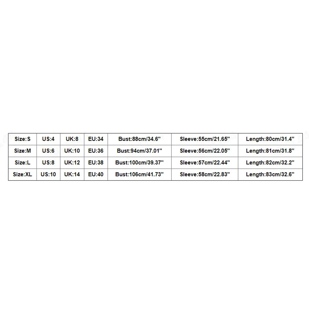 Размер США Великобритания ЕС Бюст Рукав Длина S 4 8 34 88 см/34,6" 55 см/21,65'' 80 см/31,4" М 6 10 36 94 см/37,01'' 56 см/22,05'' 81 см/31,8" L 8 12 38 100 см/39,37'' 57 см/22,44'' 82 см/32,2" XL 10 14 40 106 см/41,73'' 58 см/22,83'' 83 см/32,6"