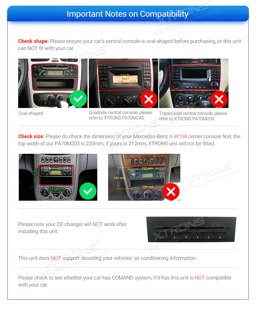 2. Пожалуйста, сначала проверьте размер вашей центральной консоли Mercedes-Benz A-W168, Верхняя ширина нашей PBX70M203 составляет 223 мм, если ваша 212 мм, блок XTRONS не будет установлен.