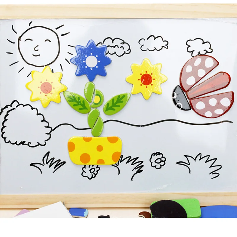 Дети могут рисовать маркером, мелом или играть в деревянные головоломки с обеих сторон, доску и доску, так много рисования и письма удовольствие для детей. Нанесение пазлов на доску и рисование некоторых фотографий, которые помогут детям самостоятельно обдумывать, идеальные Развивающие игрушки для малышей. Съемная доска с крышкой, которая может стоять на коробке. Дети также могут хранить деревянные пазлы в коробке сами по себе после настольной игры, лучшие обучающие игрушки для путешествий Рисунок или быть доставлены в любом месте.