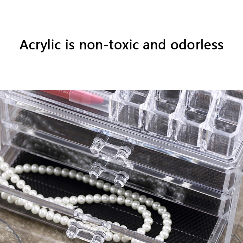 2. материал: Изготовлен из прочного высококлассного литого акрила, гораздо прочнее и безопаснее, чем стекло, предназначен для ежедневного использования и четкой конструкции позволяет легко найти то, что вы ищете; съемная черная сетчатая подкладка сохраняет ваши украшения защищенными и на месте, а также сохраняет ящики чистыми и смягчает макияж