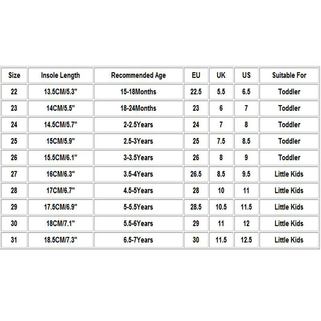 Размер Стельки Длина Рекомендуемый возраст ЕС Великобритания Свяжитесь с нами Подходит для 22 13,5 см/5,3" 15-18Months 22,5 5,5 6,5 Для детей ясельного возраста 23 14 см/5,5" 18-24Months 23 6 7 Для детей ясельного возраста 24 14,5 см/5,7" 2-2.5Years 24 7 8 Для детей ясельного возраста 25 15 см/5,9" 2,5, для возраста до 3 лет 25 7,5 8,5 Для детей ясельного возраста 26 15,5 см/6,1" 3-3.5Years 26 8 9 Для детей ясельного возраста 27 16 см/6,3" 3,5-4 лет 26,5 8,5 9,5 Дети дошкольного возраста 28 17 см/6,7" 4,5-5 лет 28 10 11 Дети дошкольного возраста 29 17,5 см/6,9" 5-5.5Years 28,5 10,5 11,5 Дети дошкольного возраста 30 18 см/7,1" 5,5-6 лет 29 11 12 Дети дошкольного возраста 31 18,5 см/7,3" 6,5-7 лет 30 11,5 12,5 Дети дошкольного возраста