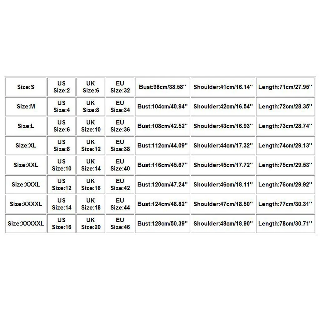 Размер Размер США Размер Великобритании Европейский размер Бюст Плечо Длина S 2 6 32 98 см/38,58 дюйма 41 см/16,14 дюйма 71 см/27,95 дюйма М 4 8 34 104 см/40,94 дюйма 42 см/16,54 дюйма 72 см/28,35 дюйма L 6 10 36 108 см/42,52 дюйма 43 см/16,93 дюйма 73 см/28,74 дюйма XL 8 12 38 112 см/44,09 дюйма 44 см/17,32 дюйма 74 см/29,13 дюйма XXL 10 14 40 116 см/45,67 дюйма 45 см/17,72 дюйма 75 см/29,53 дюйма XХХL 12 16 42 120 см/47,24 дюйма 46 см/18,11 дюйма 76 см/29,92 дюйма XXXXL 14 18 44 124 см/48,82 дюйма 47 см/18,50 дюйма 77 см/30,31 дюйма XXXXXL 16 20 46 128 см/50,39 дюйма 48 см/18,90 дюйма 78 см/30,71 дюйма
