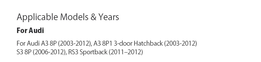 Для Audi A3 8P (2003-2012), A3 8P1 3-дверей (2003-2012), S3 8P (2006-2012), RS3 Sportback (2011-2012)