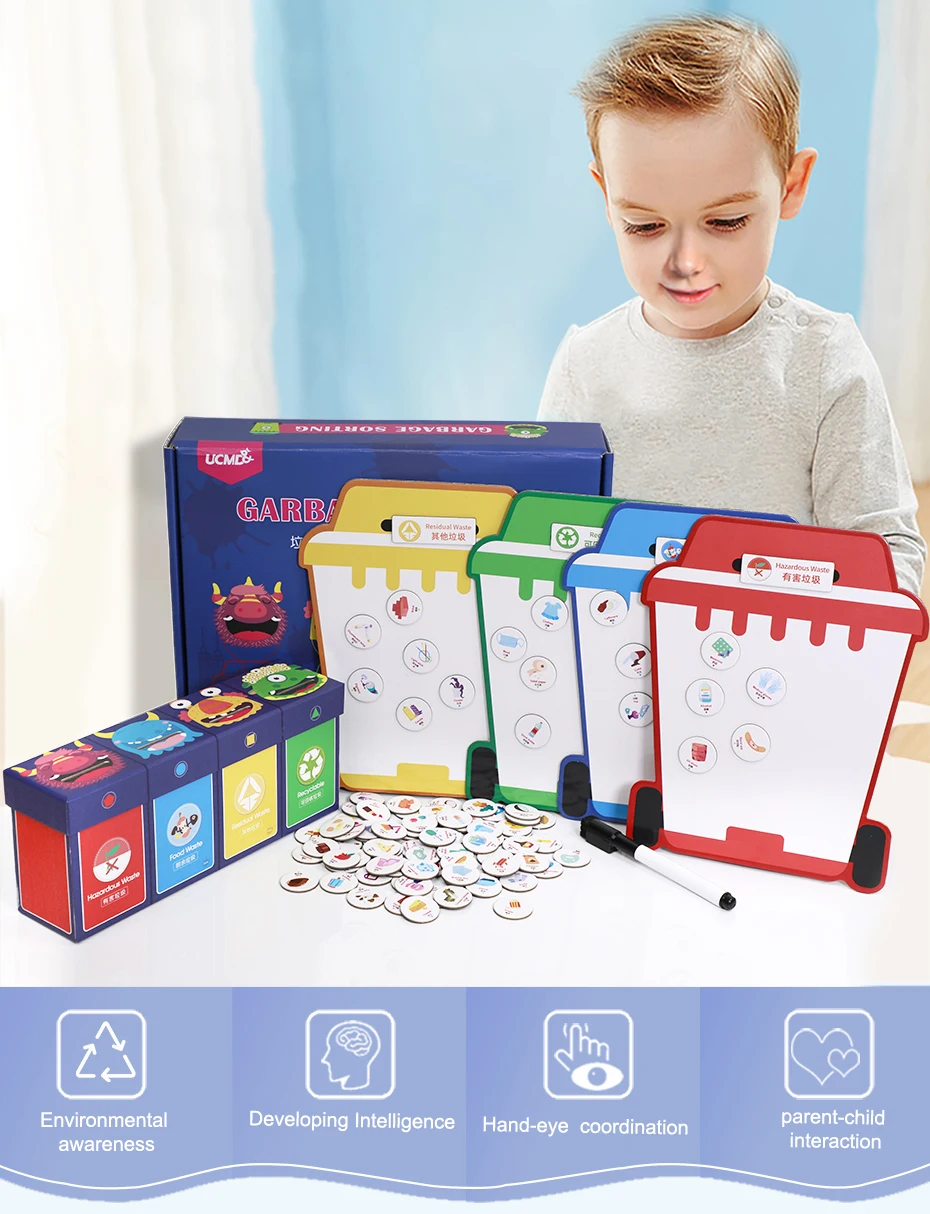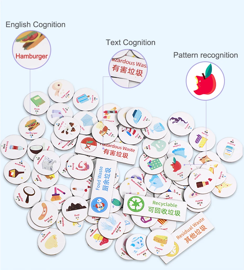 1. Продукт-игрушка для сортировки мусора. Он развивает экологическую осведомленность и способность к обучению детей с раннего возраста. 2. Продукт использует экологически чистые материалы, дети безопасны в использовании, легко переносятся, гладкие края. 3. Он также может использоваться в качестве семейных игр, улучшает отношения между родителями и детьми. 4. Яркий цвет может улучшить цветовую когнитивную способность ребенка и способствовать развитию зрения. 5. Знайте классификацию мусора и развивайте хорошие привычки.