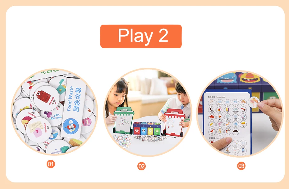 1. Выньте все магниты для мусора на столе и испортите карту 2. Поместите магниты для мусора в соответствующий мусорный бак 3. Родители могут открыть внутреннюю крышку, чтобы проверить, правильно ли засекречены магниты для мусора.