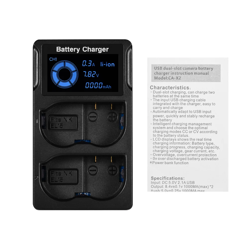 Разработан с 2 каналами батареи, может заряжать 2 шт батареи одновременно; Быстрая зарядка, занимает всего 2-3 часа, чтобы заполнить две батареи одновременно.