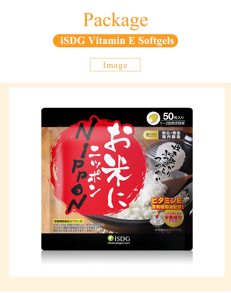 (Производство) Япония 【Function】повышение уровня иммунной системы, отбеливания кожи и омолаживания. 【Direction】 готовьте с рисом или напитком с водой 【Capacity】 50 sofegels (Срок годности) 3 года. 【Ingredients】Vitamin E, растительное масло. 【Кто может взять 】вся толпа (Противопоказания) Если Вы беременны, кормите грудью или имеете какое-либо заболевание, пожалуйста, проконсультируйтесь с Вашим врачом, до того, как начнёте приём. Пейте больше воды во время курса приёма, так продукт усвоится лучше. Не употребляйте кофе или чай во время приёма продукта. Так как это пищевая добавка, эффект которой нельзя сравнить с медициной, то требуется 1-2 месяца, чтобы наш организм накопил питательные вещества и появился эффект.