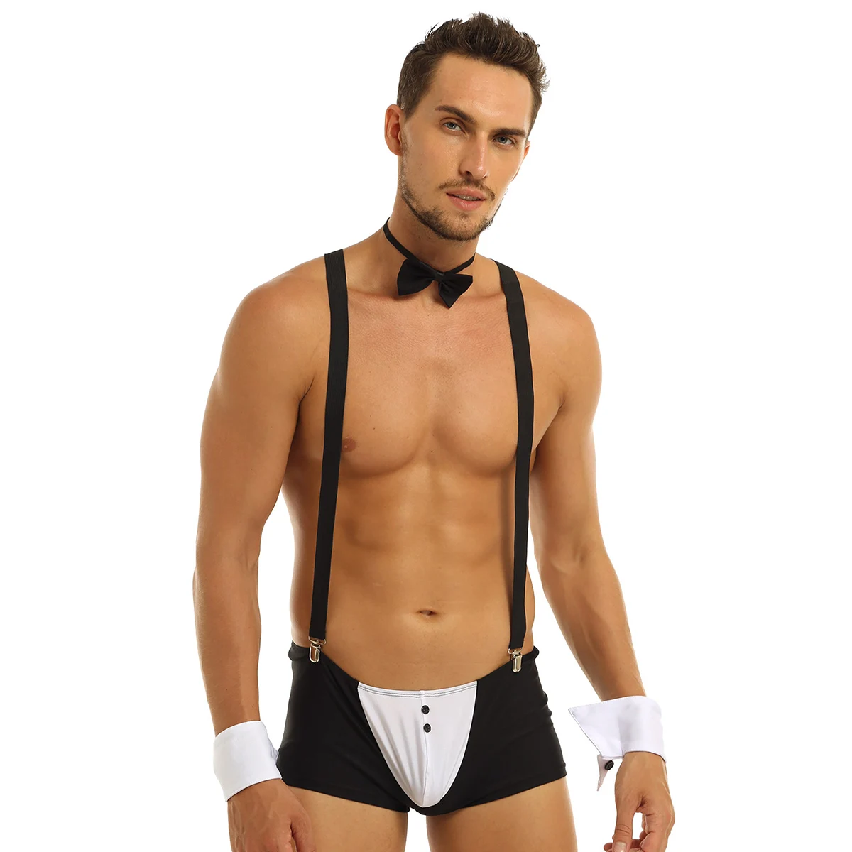Поставляется с эластичным галстуком-бабочкой и манжетами и эластичными плечевыми подтяжками с серебряными зажимами спереди и сзади.