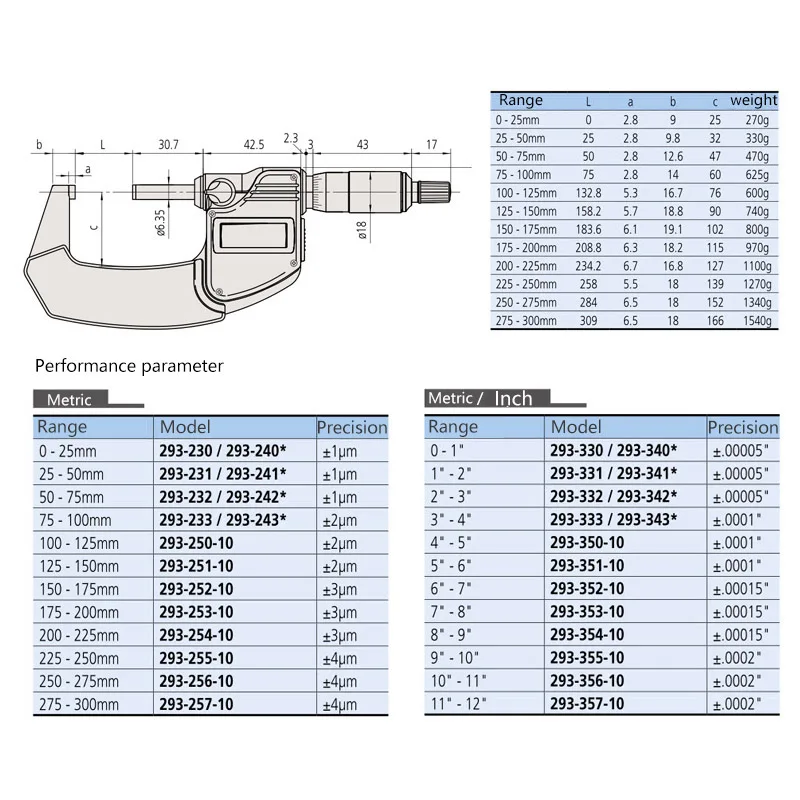 Микрометра винтовой датчик имеет измерительные поверхности с параллельности 0,3 мкм/0,000012 и четкий лазерный весы для повышения точности при выборе модели просим во всех аспектах.
