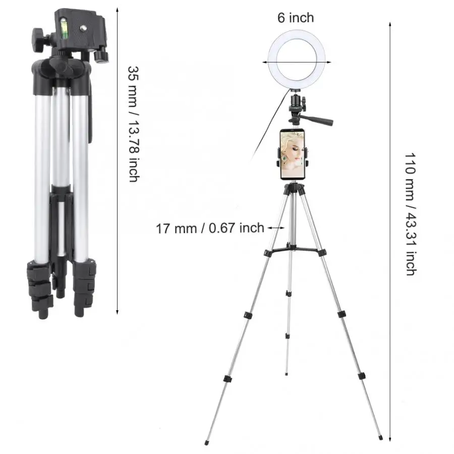 Принимает 68 штук высокое качество светодиодный лампы постоянное потребление тока, высокий индекс цветопередачи, низкое энергопотребление, безопасный и охране окружающей среды и длительный срок службы. 6-дюймовый светодиодный кольцевой свет, сделанный из материала хорошего качества, однотонные, долговечная и легкая. Широко используется в наружной фотосъемке, для льющегося света в помещении, портретной, модной, рекламной фотографии, съемки видео и т. Д. 3000-5500 K Цветовая температура, поддержка затемнения для удовлетворения различных условий съемки. Порты USB можно использовать с несколькими устройствами, такими как Подключение компьютера хоста, ноутбука, банка питания и usb-зарядного устройства. Поставляется со штативом, регулируемая высота 35-110 см, изготовлен из высококачественного сплава, высокая прочность, легкий и прочный. Параметры: