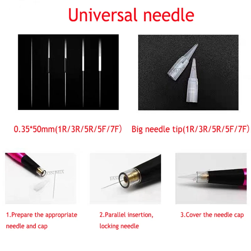 Подходит: 0,35*50 мм (1R/3R/5R/5F/7F) Подходит: большой Наконечник иглы (1R/3R/5R/5F/7F Шаги для загрузки иглы 1. Подготовьте подходящие Иглы и кепки 2. Параллельная вставка, Блокировки иглы 3. Крышка иглы