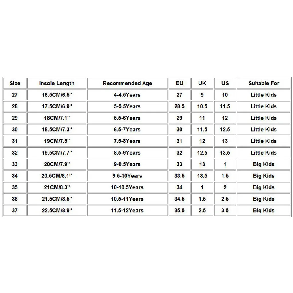 Размеры Стельки Длина Рекомендуемый возраст ЕС Великобритания Свяжитесь с нами Подходит для 27 16,5 см/6,5" 4-4.5Years 27 9 10 Дети дошкольного возраста 28 17,5 см/6,9" 5-5.5Years 28,5 10,5 11,5 Дети дошкольного возраста 29 18 см/7,1" 5,5-6 лет 29 11 12 Дети дошкольного возраста 30 18,5 см/7,3" 6,5-7 лет 30 11,5 12,5 Дети дошкольного возраста 31 19 см/7,5" 7,5-8 лет 31 12 13 Дети дошкольного возраста 32 19,5 см/7,7" 8,5-9 лет 32 12,5 13,5 Дети дошкольного возраста 33 20 см/7,9" 9-9.5Years 33 13 -1 шт. Дети младшего школьного возраста 34 20,5 см/8,1" 9,5-10 лет 33,5 13,5 1,5 Дети младшего школьного возраста 35 21 см/8,3" 10-10.5Years 34 -1 шт. 2 Дети младшего школьного возраста 36 21,5 см/8,5" 10,5-11 лет 34,5 1,5 2,5 Дети младшего школьного возраста 37 22,5 см/8,9" 11,5-12 лет 35,5 2,5 3,5 Дети младшего школьного возраста