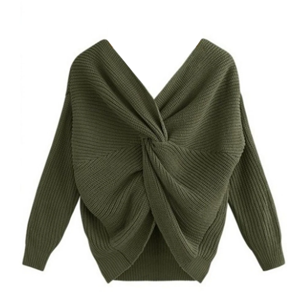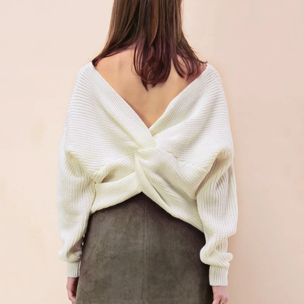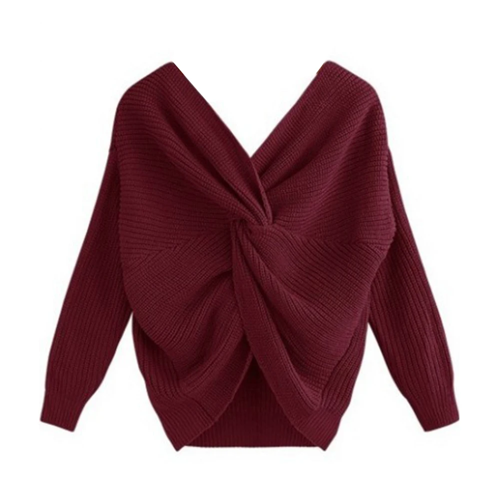 Женский Однотонный свитер с v-образным вырезом и узлом сзади, джемпер с длинным рукавом