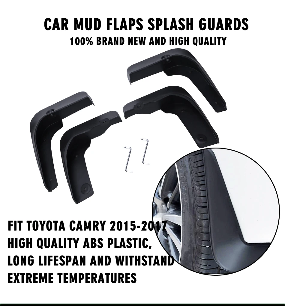Технические характеристики: Состояние на 100% абсолютно новый Материал: АБС-пластик, Пластик В комплект входит: 1 комплект, как на фотографиях Особенности: Изготовлен из прочных материалов для предотвращения дождя, песка и других возможных прямых повреждений при нанесении краски/крылья автомобиля Используя высококачественную пластиковую утонченность, эти брызговики легкие гибкие и прочные! Очень прочный даже при столкновении с жесткими предметами. Простой и элегантный дизайн, чистый черный цвет Брызговики держать его выглядит чистым и свежим стилизованным! Подходящие модели: Для Toyota Camry 2015-2017 Пожалуйста, дважды проверьте описание товара и фотографии, чтобы сравнить размеры с вашим автомобилем перед заказом. **-Четкие фотографии и измерения, где это возможно-предоставляются, пожалуйста, проверьте его как можно больше, чтобы убедиться, что это правильный товар для вас. -Пожалуйста, учитывайте разницу в размерах на 0,5-1 дюйм из-за различных методов измерения -Инструкции по установке не включены в комплект, Профессиональная установка настоятельно рекомендуется!, Если вам нужна помощь, свяжитесь с нами в любое время ** Пожалуйста, проверьте фотографии и описание и убедитесь, что этот товар подходит для вашей модели. Сделайте ваш автомобиль выглядеть выдающимся и роскошным с нашим высоким качеством отделка деталей наклейки и чехлы Удовлетворенности наших клиентов: При возникновении любых вопросов вы можете с нами связаться. Мы стремимся к удовлетворению ваших 100% клиентов. Пожалуйста, дайте нам возможность разрешить проблему. Мы понимаем ваше возможное беспокойство и расстройство и мы постараемся сделать все возможное для решения возникшей проблемы. Примечание: цвет изделия, отображаемый на фотографиях, может немного отличаться от цвета на мониторе компьютера, так как мониторы не откалиброваны так же.