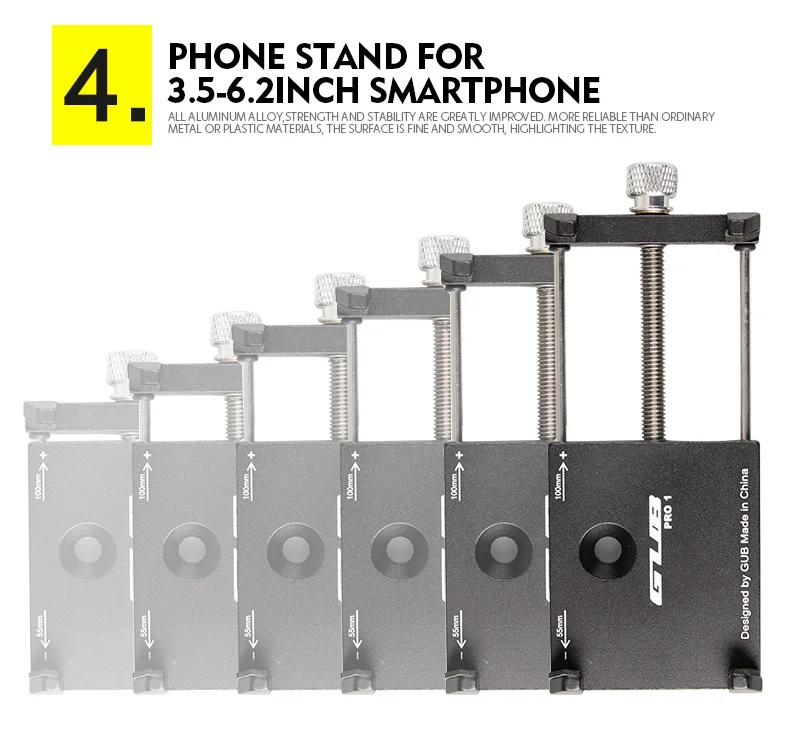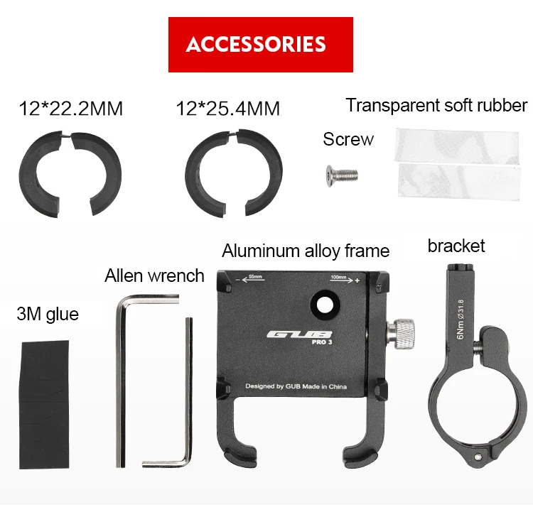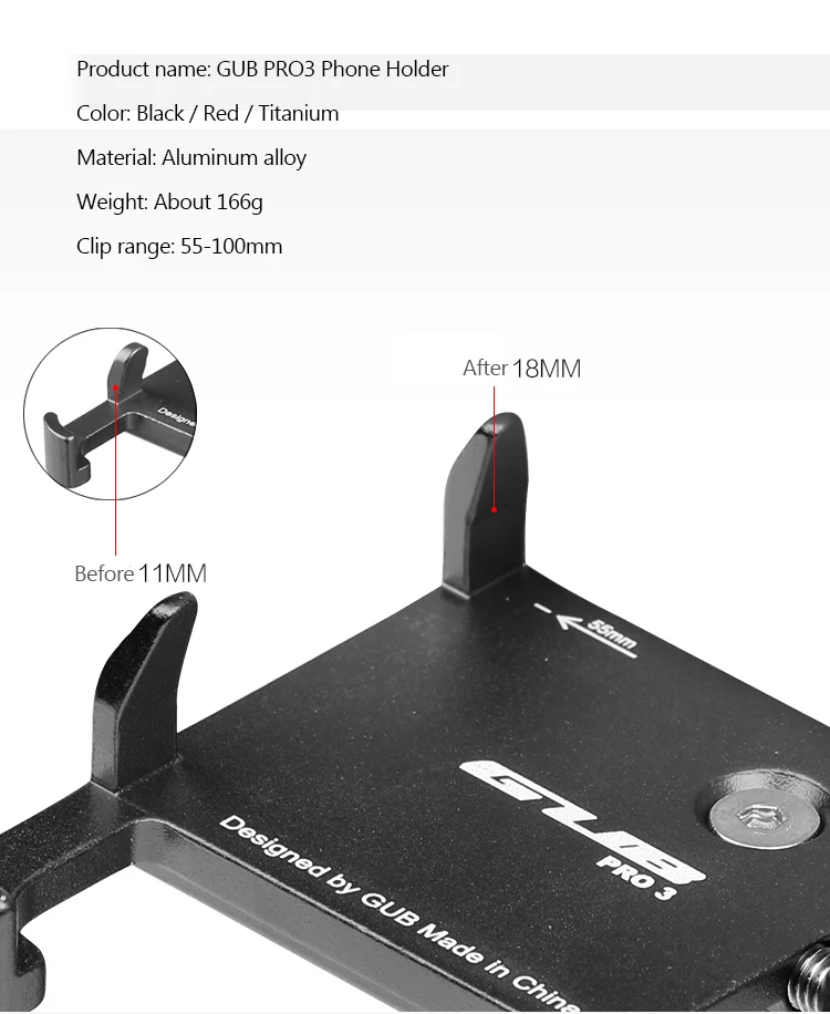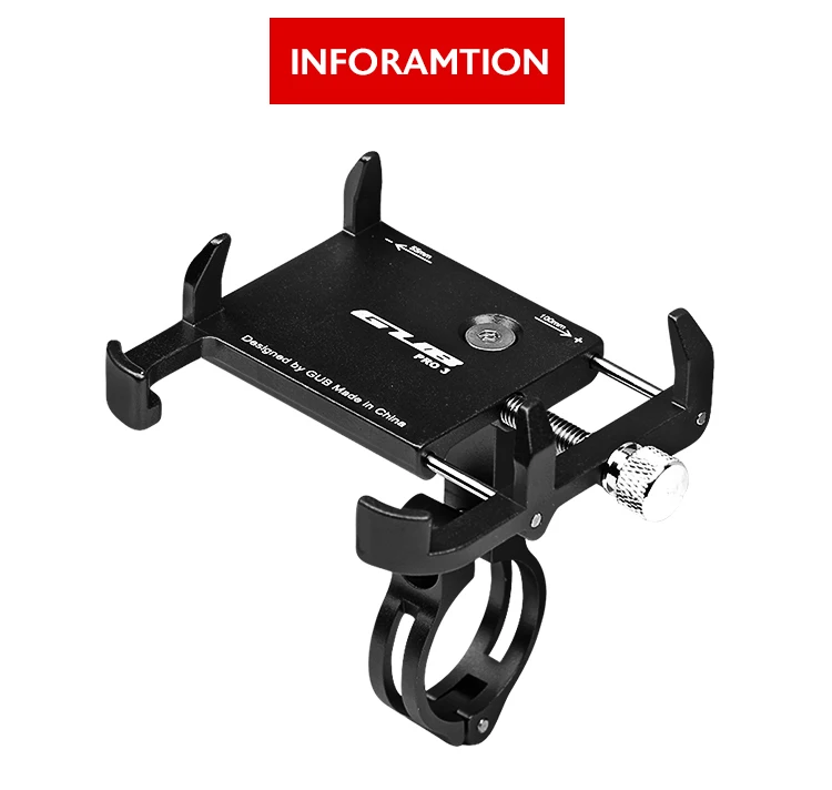 Бренд: GUB Название: универсальный велосипедный держатель для телефона из алюминиевого сплава Материал: алюминиевый сплав Цвет: красный, черный, титан, серебристый Подходит для: подходит для смартфонов 3,5 "до 7,5", pro3 подходит для power bank Вес: Pro 1-103 г, Pro3-112g Ширина: 55-100 мм Диаметр зажима: 22,2-31,8 мм