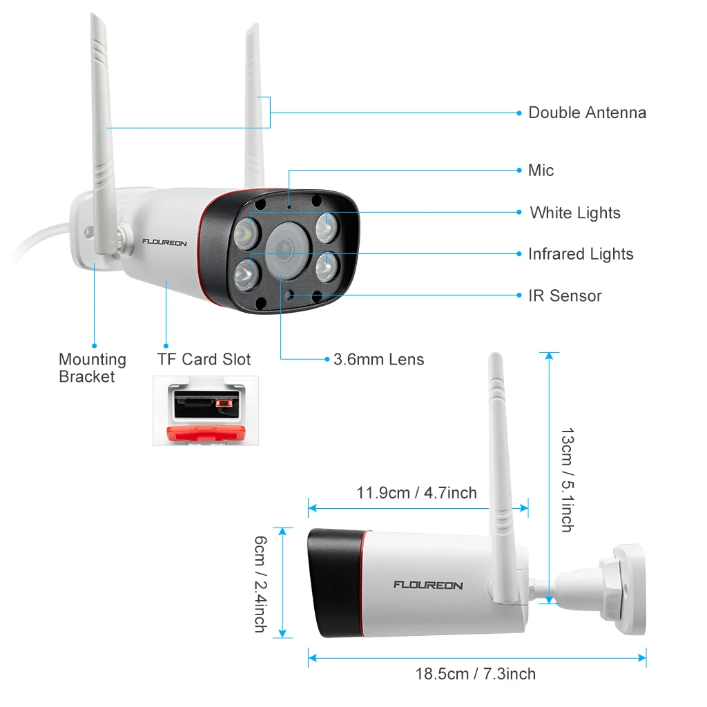 -Для домашней безопасности: с кристально прозрачными изображениями 1080 p. Идеальный двойной светильник IP bullet camera для вне вашего дома, офиса, магазина и других мест, чтобы сохранить вашу безопасность. -Двойной светильник ip-камера с ночным видением: Двойной ИК-датчик для 24/7 наблюдения. Обнаружение движения активирует двойной белый светильник s (пользователи могут настроить режим запуска и время белый светильник). Получайте оповещения через приложение (Совместимость с iOS и Android). Подключение к камере через 2,4 ГГц wifi. -Облачное хранилище: также вставьте tf-карту макс. 128 ГБ (карта не входит в комплект). Убедитесь, что Вы сохраните важные кадры безопасности. -2-полосная аудио: позволяет предупредить от любых вторжений. Или если ваша посылка прибывает, когда вы выходите из дома, просто сообщите водителю, где ее оставить. -Простая установка и водонепроницаемость: Следуйте инструкции пользователя и используйте винты и анкеры (дюбели) для крепления к стене. Подключите к источнику питания. Водонепроницаемый корпус IP66 обеспечивает работу камеры в условиях сильного дождя и других неблагоприятных погодных условий. Водонепроницаемая куртка входит в посылка, чтобы помочь защитить и сохранить кабели в порядке.