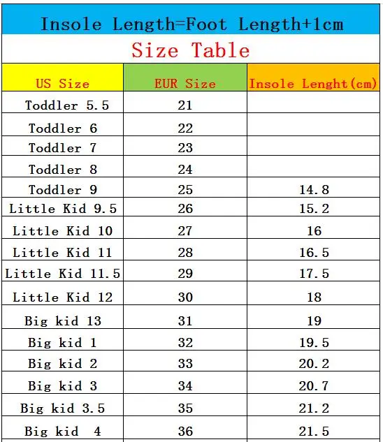 Дорогие друзья, поскольку все размеры детской обуви отличаются, при заказе детской обуви вы должны соответствовать нашим размерам и внутренней длине. Согласно длине стельки. (длина стельки = длина стопы + 1 см) американский размер не является стандартным, просто удобно для вас сделать заказ. Удобная длина стопы составляет около 1 см. И из-за длительного времени доставки авиа-отправление Почты Китая и ребенок быстро вырастет, пожалуйста, выберите обувь большего размера для вашего ребенка. Пожалуйста, выберите правильный размер. Вся обувь будет отправлена с пузырчатыми сумками, без коробок!