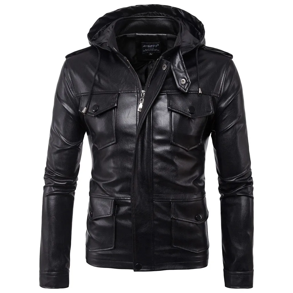 Мужская кожаная куртка осень-зима, Байкерская верхняя одежда на молнии, пальто с капюшоном