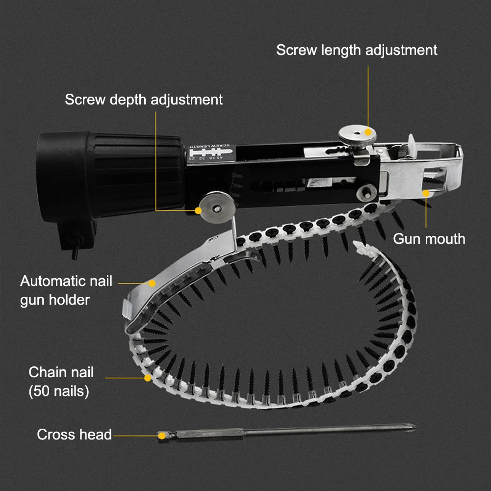 1 комплект, автоматическая винтовая цепь, пистолет для ногтей, адаптер для электрической дрели, деревообрабатывающий инструмент, беспроводная силовая дрель, крепление, цепь для головы, стойка