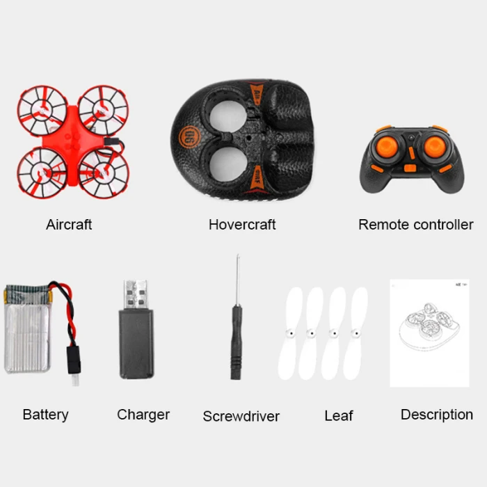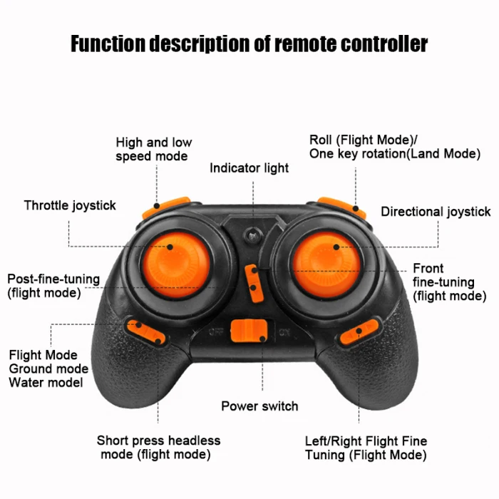 Функция: вверх/вниз, вперед/назад, поворот влево/вправо, боковой полет, режим воздушного полета (только самолет), режим наземного вождения, серфинг над водным режимом, 3 уровня скорости полета, Безголовый режим, автоматический возврат одним нажатием кнопки, 360 градусов, автоматическая сигнализация