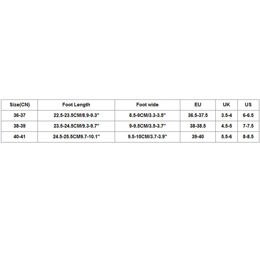 Размер (CN)Длина стопыШирокая стопаЕСВеликобританияСША36-3722,5-23,5 см/8,9-9,3 дюйма8,5-9 см/3,3-3,5 дюйма36,5-37,53,5-46-6,538-3923,5-24,5 см/9,3-9,7 дюйма9-9,5 см/3,5-3,7 дюйма38-38,54,5-57-7,540-4124,5-25.5CM9.7-10,1"9,5-10 см/3,7-3,9 дюйма39-405,5-68-8,5