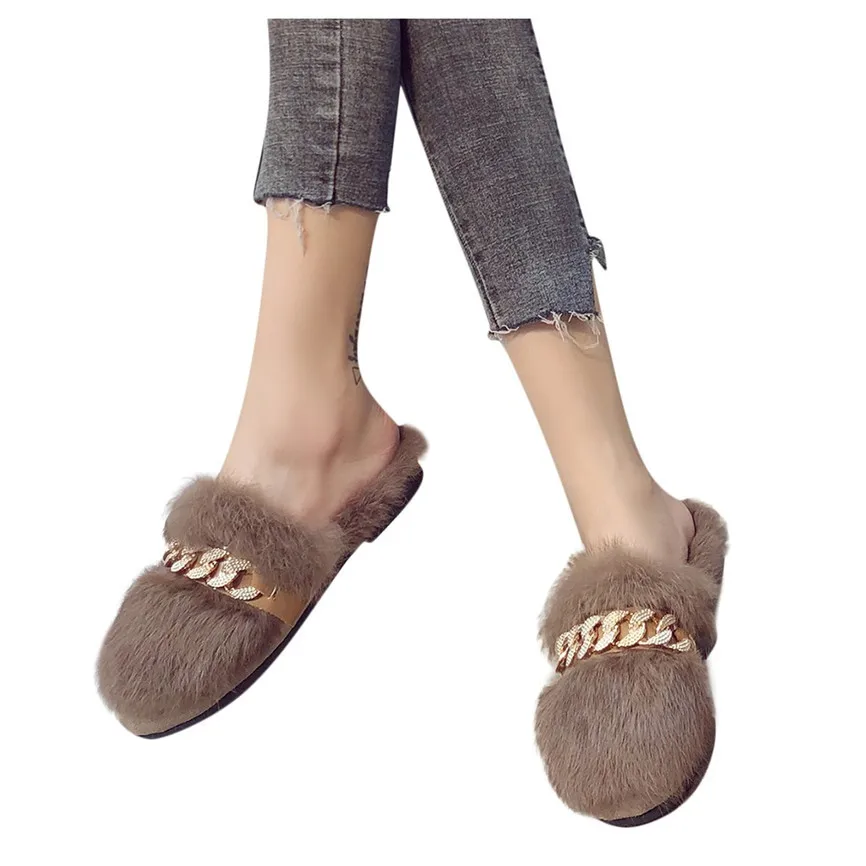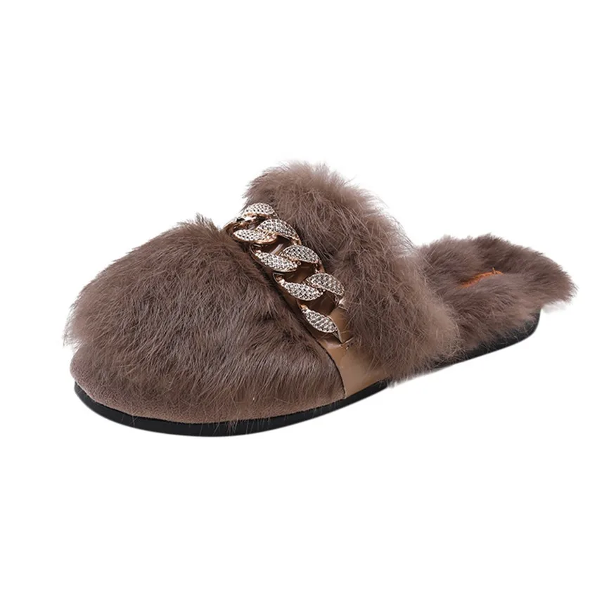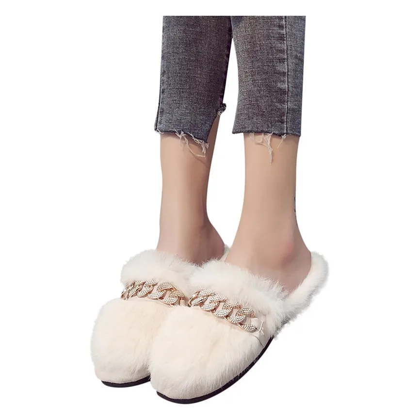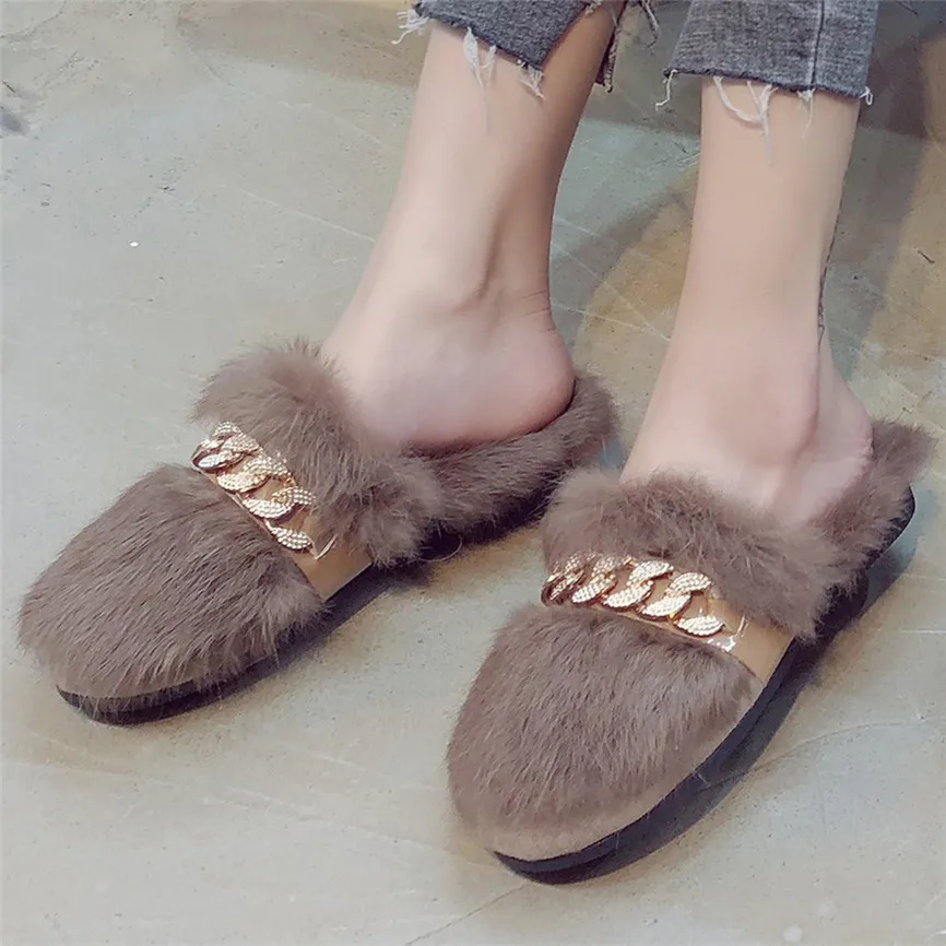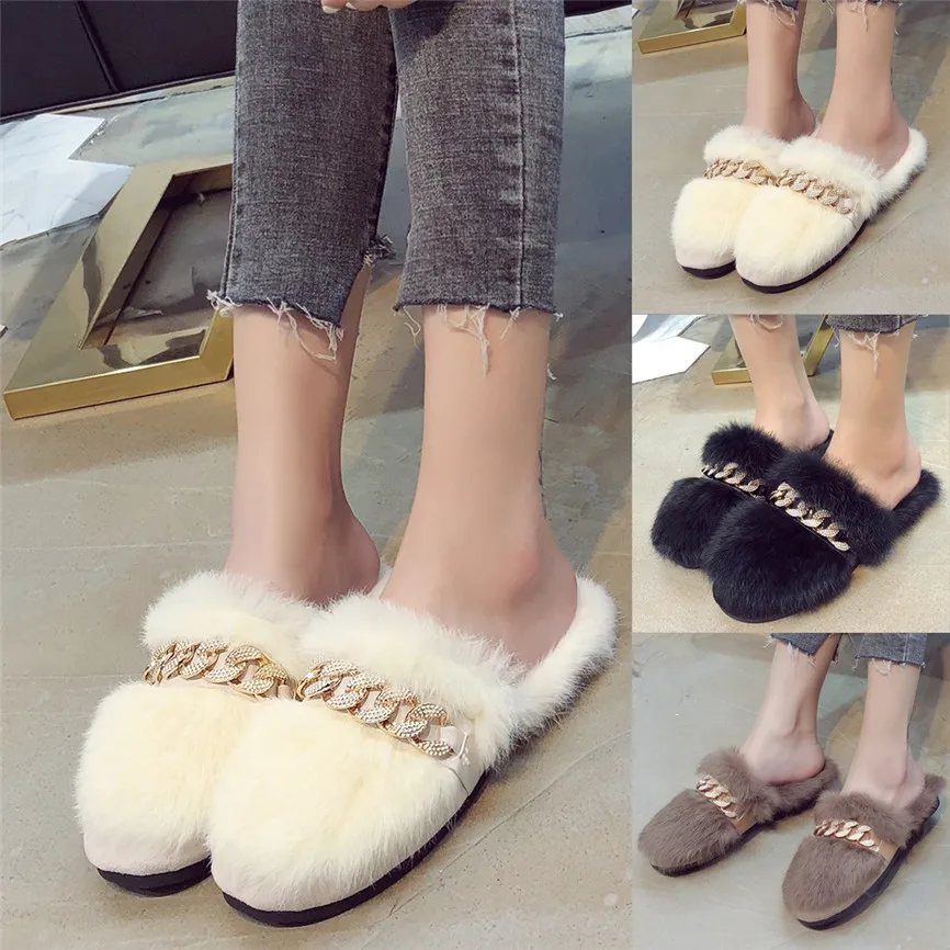 Зимние шерстяные тапочки; женские сандалии из флока; Уличная обувь на платформе; Короткие Плюшевые Тапочки без застежки; теплые тапочки с цепочкой; повседневная обувь