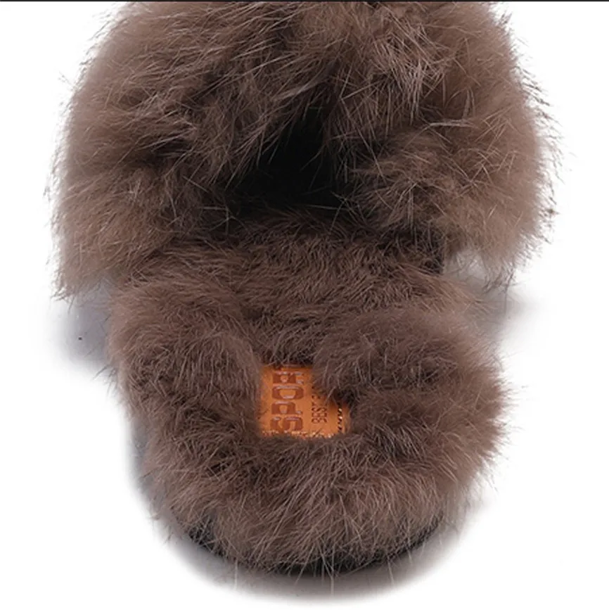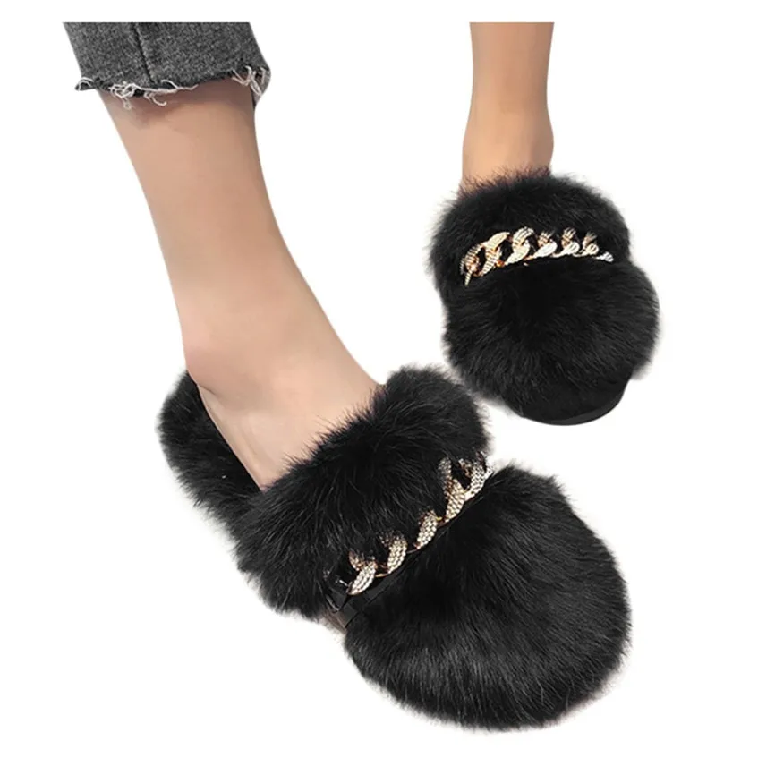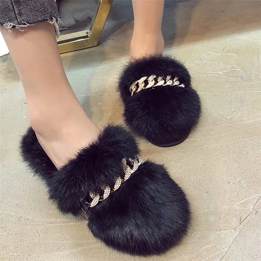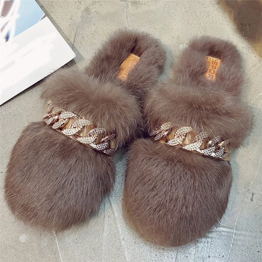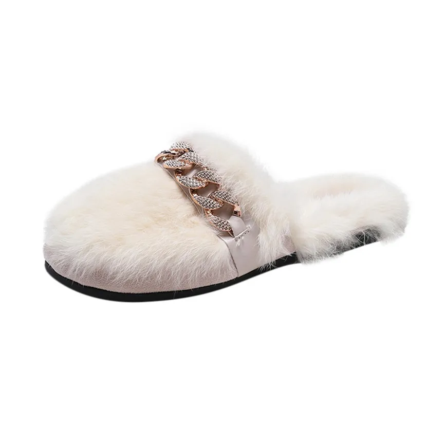 Зимние шерстяные тапочки; женские сандалии из флока; Уличная обувь на платформе; Короткие Плюшевые Тапочки без застежки; теплые тапочки с цепочкой; повседневная обувь