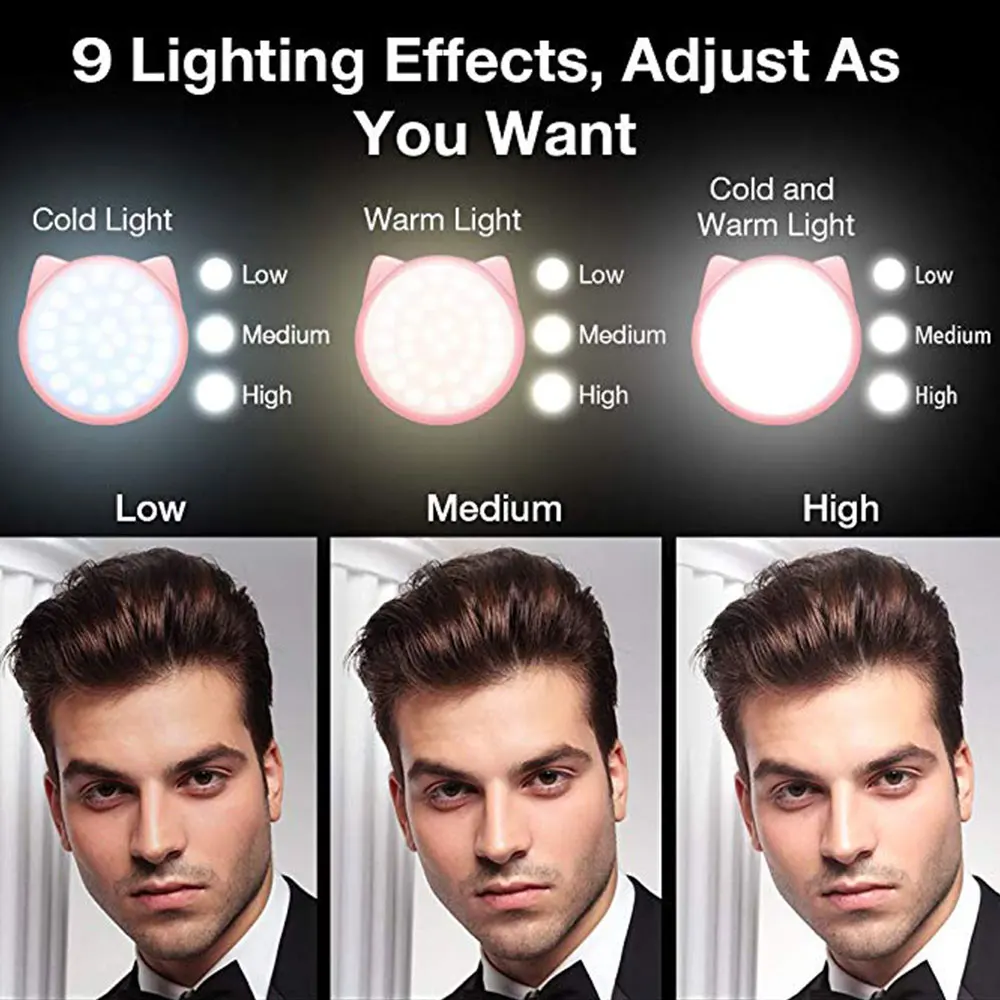 -Есть три режима на iphone селфи-светильник кольцо, холодный светильник, теплый светильник, нейтральный светильник. 3 уровня регулировки яркости для каждого режима 9 видов светильник ing эффекты для того, чтобы помочь вам сделать Селфи, макияж, красота, заполните светильник, как аварийный светильник ing и т. д.