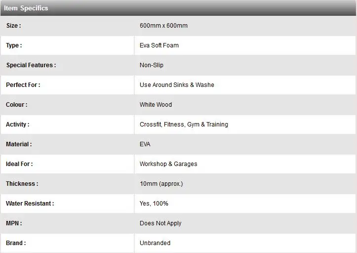 EVA пена-это мягкий, но прочный полимер этилена и винилацетата, обычно используемый в напольных покрытиях, но также в спортивном оборудовании, ремеслах, И набор дизайн. Этот материал обычно используется для изготовления шлепанцев, так как он мягкий, без напыления. EVA пены легко работать с и поставляется в разные цвета и толщины. · Пол из пенопласта eva идеально подходит для тренажерных залов, тренажерных залов, весовых залов, торговых шоу, студий боевых искусств и многого другого. · Поролоновые коврики легко блокируются для быстрой установки и удаления. · Их можно транспортировать, хранить и переустанавливать без проблем. · Удобный материал, обеспечивающий правильное количество амортизации для безопасных и комфортных упражнений, игр и работы. · Мягкость материала уменьшает усталость от длительного времени стоя. · Пена EVA также поглощает шум-дополнительный плюс для весовой комнаты или рабочей комнаты. · Легко моется и устойчива к химическим веществам, что делает его идеальным для потных тренажерных залов или игровых комнат. · Высокая устойчивость к погодным условиям и низкое поглощение воды, поэтому он может выдерживать разливы, влажные ноги и грязные домашние животные. · Родители любят, что материал нетоксичный, и BPA бесплатно, а также мягкий для падений.