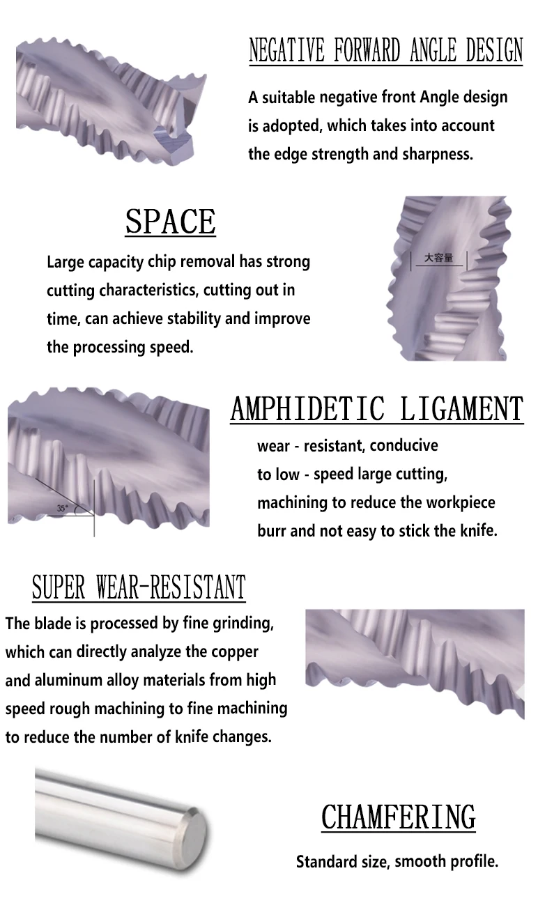 Продукт имеет двойной дизайн Связки, большую резку, антипригарный нож, быстрое удаление чипов, отличную прочность и износостойкость, эксклюзивный для обработки самолета, боковой обработки, резки слотов, дизайн полумесяца для улучшения остроты, обработки различных материалов ≤ 55 градусов.