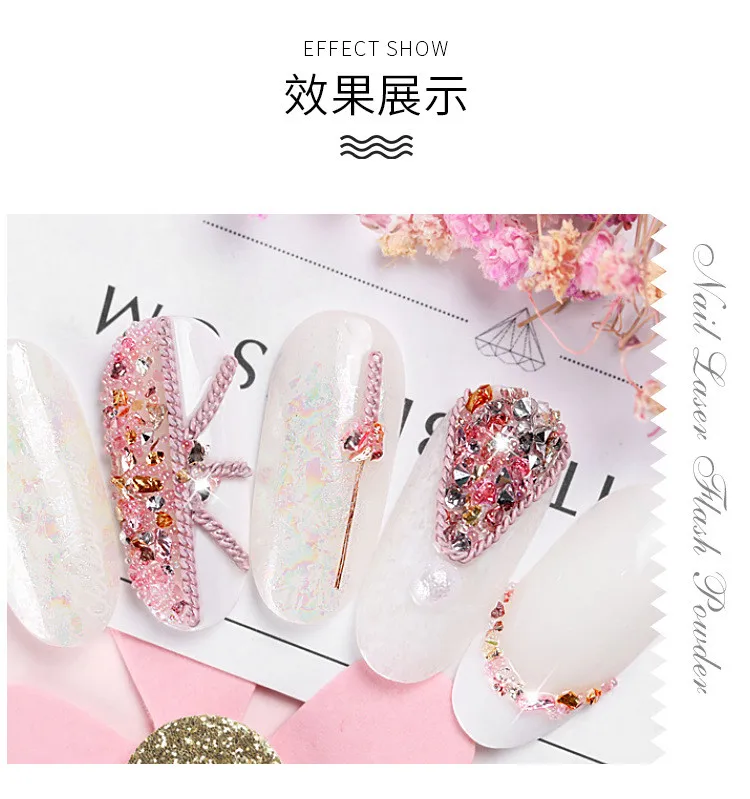 Для использования: Очистите поверхность ногтя, нанесите дно и поместите частицы на гвоздь.