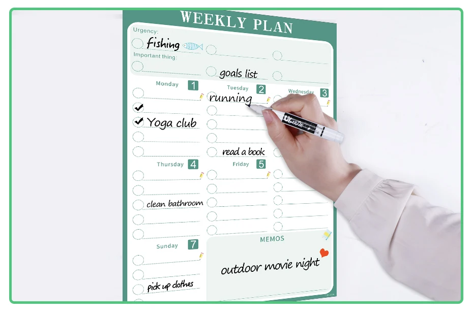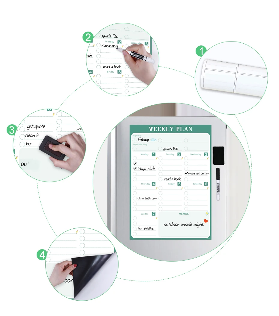 Стираемая поверхность и ручка для белой доски обеспечивают бесконечную удобство использования. Нет необходимости получать другой календарь. Месяц закончился? Все, что вам нужно сделать, это вытереть ваш календарь и начать заново-это так просто!