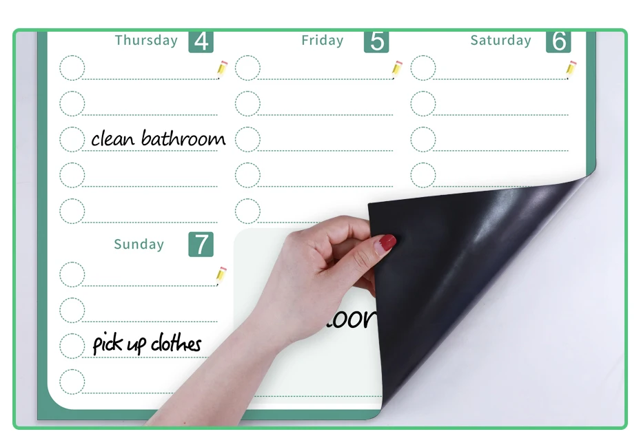 Описание: магнитный календарь, Детские chore chart, магнитное расписание, to-do list Материал: магнитный порошок, резина, HD печать, ПЭТ пленка. Особенности: самомагнитный, гибкий, поддержка письма, портативный, прочный. Размер: 42*30 см Толщина: 0,4 мм Стираемость: сухая стирается, долговечная яркая и легко очищается. Применение: нанесите на поверхность из железа, например, на холодильник и так далее.