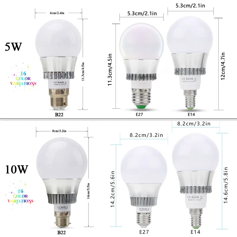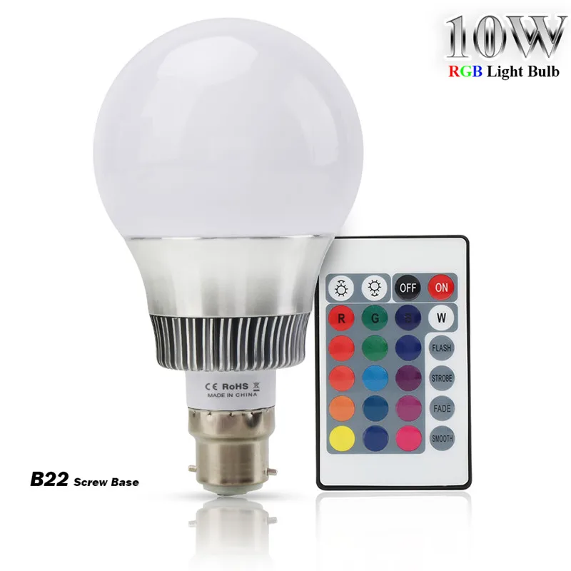 Тип основания:E27/E14/B22Мощность:5 Вт/10 ВтВход:AC85-265VСветильник:16 цветов, RGB(Сменный)Угол луча:180 градусовБатарея пульта дистанционного управления:1 х батарейка CR2025 (Батарея в комплект не входит)Срок Светодиодный Дов:> 50000 часовГарантия:1 годУтверждения:CE/RoHS/FCCПодходит для освещения и украшения дома/вечерние и т. Д.Пульт дистанционного управления