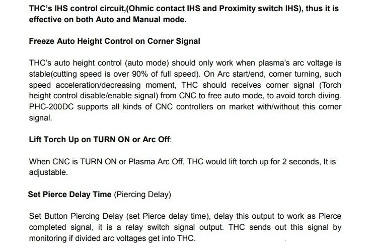 3. Автоматический контроль высоты при заморозке на угловые сигнальные PTHC-200DC заблокирует автоматический режим при получении Угловые сигнальные от системы ЧПУ, чтобы избежать погружения факела во время цикла старт/конец, поворот углов.
