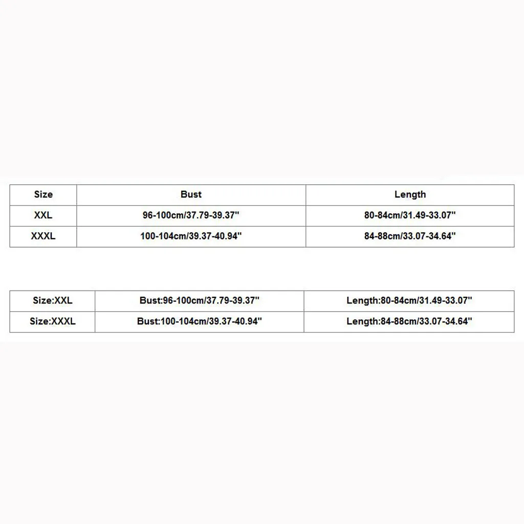 Размер Бюст Длина XXL 96-100 см/37,79-39,37" 80-84 см/31,49-33,07" XХХL 100-104 см/39,37-40,94" 84-88 см/33,07-34,64"