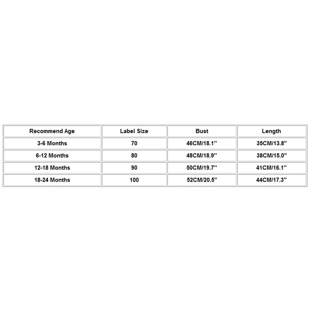 Рекомендуемый возраст Размер этикетки Бюст Длина 3-6 месяцев 70 42 см/16,5'' 35 см/13,8" 6-12 месяцев 80 44 см/17,3" 37 см/14,6'' 12-18 месяцев 90 46 см/18,1" 38 см/15,0'' 18-24 месяцев 100 48 см/18,9" 40 см/15,7''