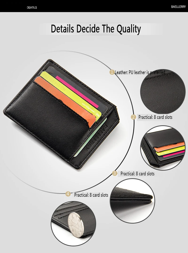 Бренд: Baellerry Материал: искусственная кожа Общий вес: около 50 г Размер: 11 см * 8,5 см * 0,3 см Кодирование: 8213T Пожалуйста, обратите внимание, что перед размещением заказа. Если у вас есть какие-либо вопросы, пожалуйста, свяжитесь с нами. Спасибо!