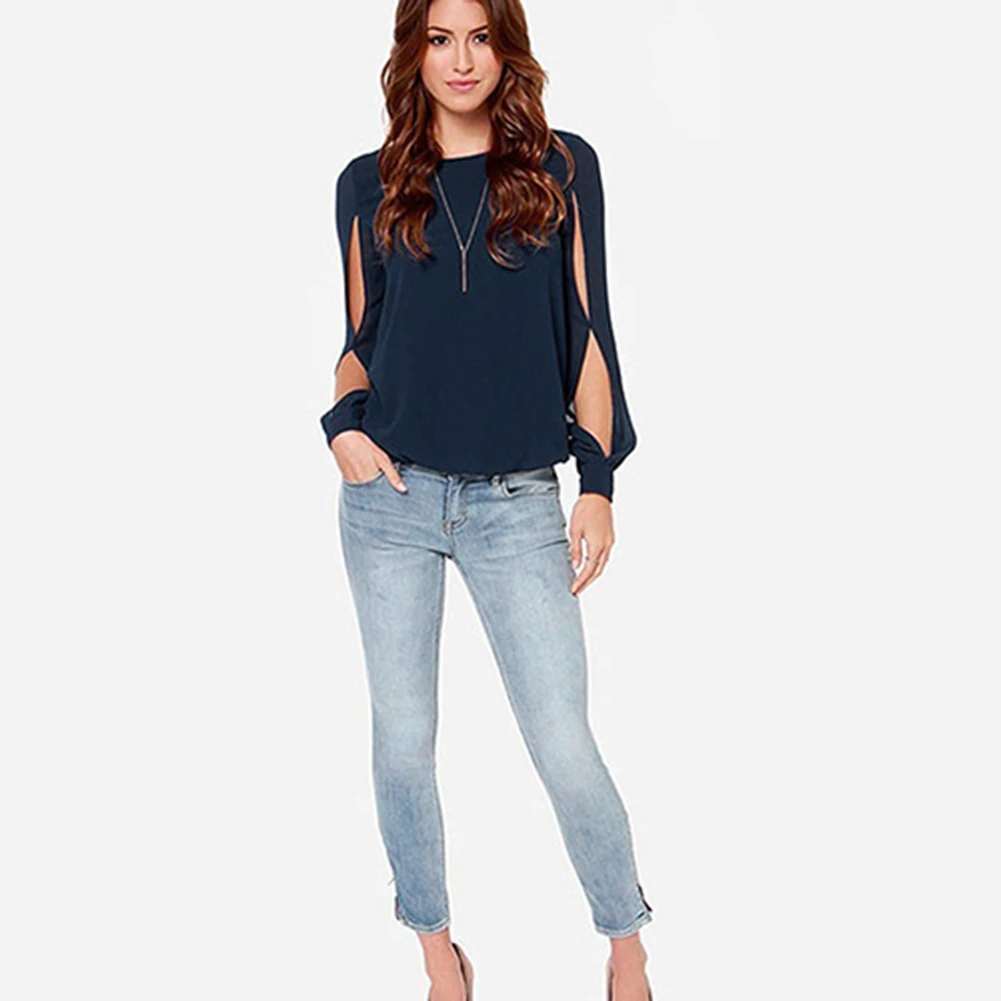 Женские блузки, модные с длинным рукавом и круглым вырезом, темно-синяя рубашка, винтажная шифоновая офисная блуза, облегающие повседневные топы размера плюс, женская блуза