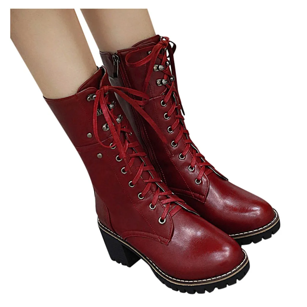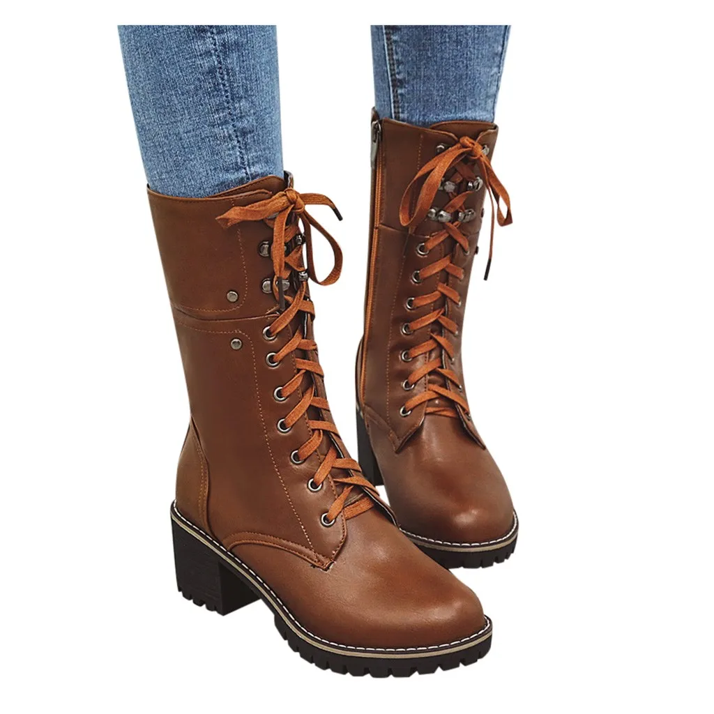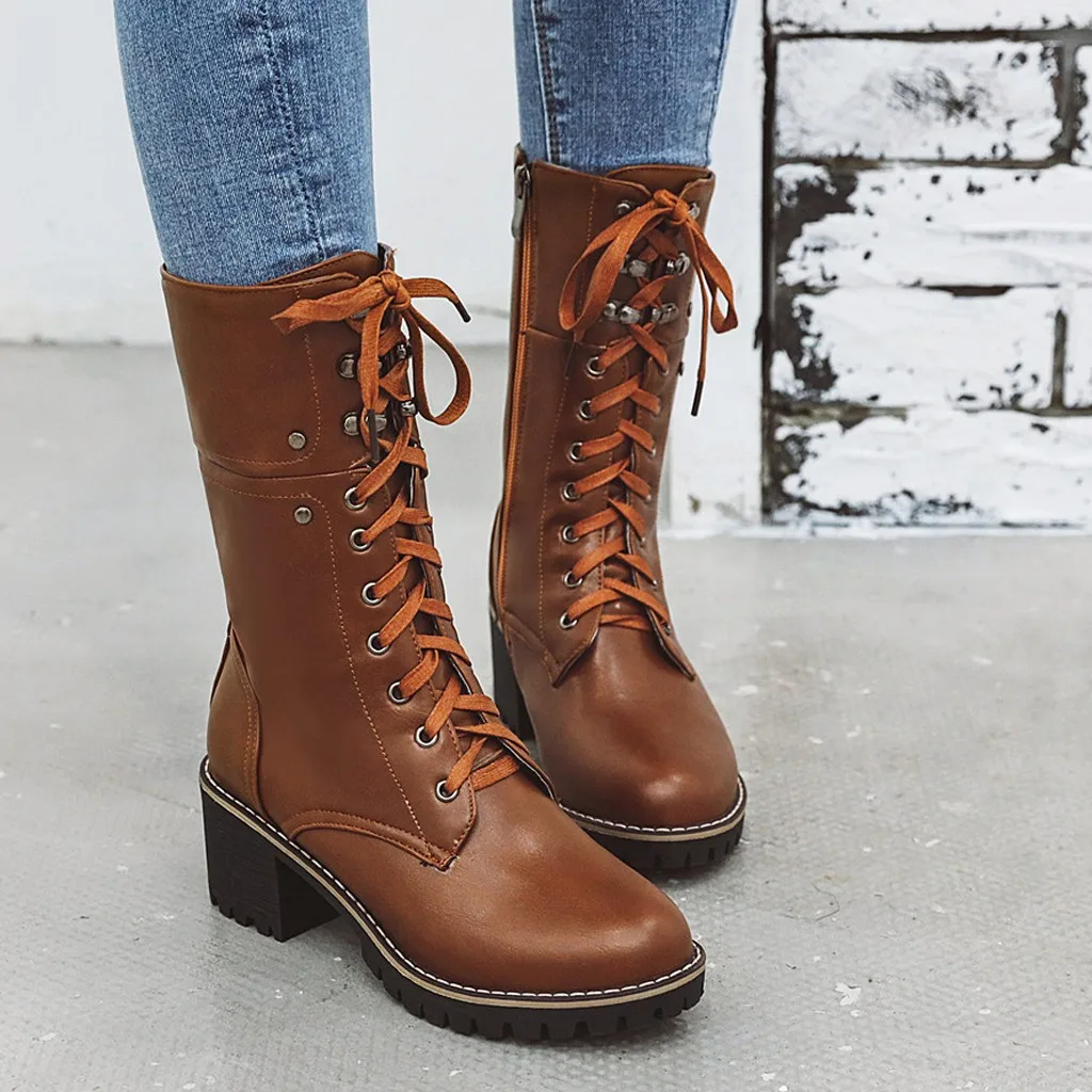 Женские ботильоны на молнии со шнуровкой; повседневные ботинки средней длины на высоком квадратном каблуке