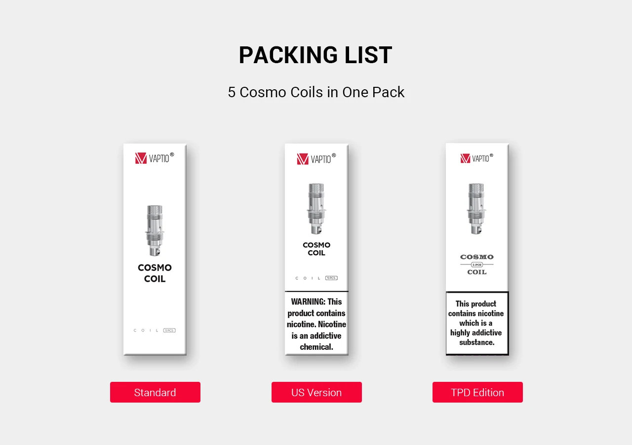 Катушка Vaptio Cosmo C1 (MTL) Материал: Kanthal Сопротивление: 1.6ohm Диапазон мощности: 10-15 Вт Катушка Vaptio Cosmo C2 (DL) Материал: Kanthal Сопротивление: 0.7ohm Диапазон мощности: 15-23 Вт