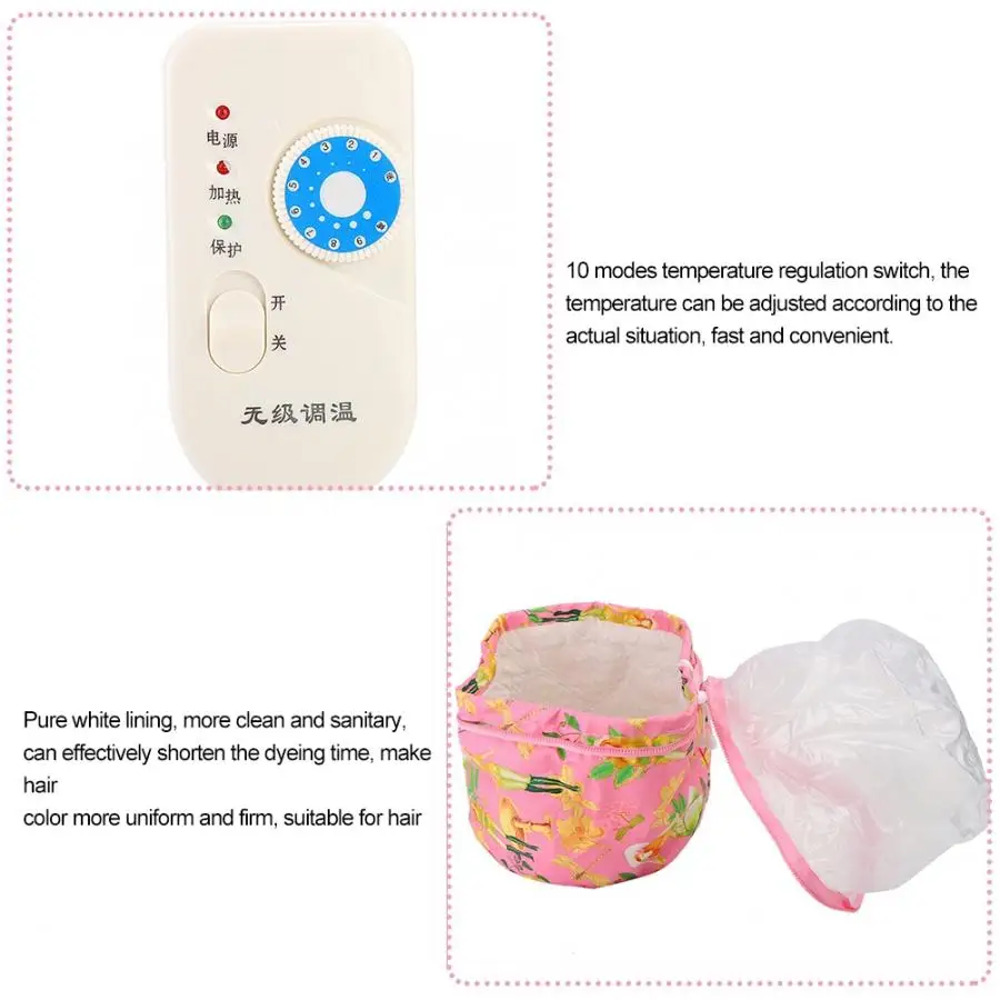 Утолщенный водонепроницаемый корпус и электростойкий материал ткани Оксфорд, надежный в использовании. Внутренний слой изготовлен из полиуретановой изоляционной ткани, что делает водонепроницаемый дизайн более надежным. Эластичный шнурок позволяет регулировать размер шапки, комфортный в использовании. Равномерная и изысканная двухслойная проволока, быстрый нагрев, питательные вещества пленки для волос более легко впитываются, имеют лучший эффект, красивый внешний вид. 10 режимов регулирования температуры переключатель, температура может быть скорректирована в соответствии с реальной ситуации, быстро и удобно. Чистая белая подкладка, более чистая и Гигиеничная, может эффективно сократить время окрашивания, сделать цвет волос более равномерным и твердым, подходит для парикмахерской для использования.