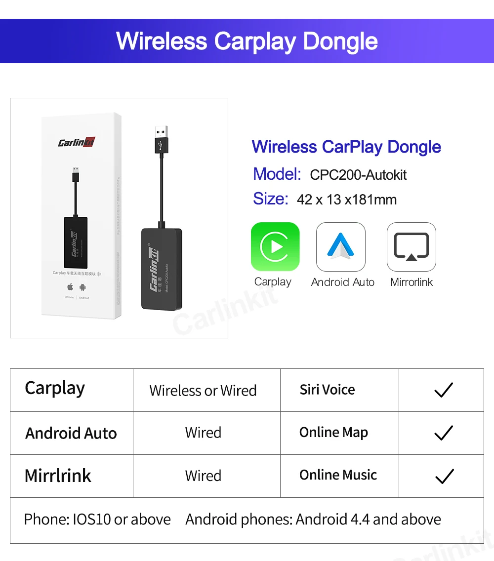 1. Голосовое управление: Поддержка Siri/музыка/карты/телефонные звонки/сообщения/аудио книги. Функция Siri поможет вам позвонить Розе или любому из ваших друзей. Пожалуйста, обратите внимание, что скорость работы нашего устройства зависит от скорости вашего телефона на ios. Характеристики: Беспроводная carplay/Беспроводная Android (только поддержка небольшой части) 2. Сенсорный экран и hd-дисплей: Направленное управление и просмотр телефона на автомобильном навигационном экране с помощью usb-кабеля. 3. Свободные руки и безопасное вождение: Совершайте/отвечайте на звонки, проверяйте голосовые сообщения, текстовые сообщения и создавайте карты. Слушайте ваши любимые песни с помощью приложений в формате «hands free», «Apple Music» или «hands free». 4. Совместимые устройства: IPhone с iOS (7,1 и выше) Мобильные телефоны Android (5 .1 и выше) Автомобильные стереосистемы с android версии (4.4.2 и выше) (Продукт поддерживает большинство телефонов на рынке Android, но это не 100% поддержка всех Android телефонов и Android Авторадио)