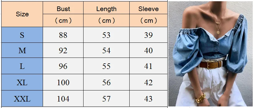 Тип: женский топ Пол: женщины Состояние на 100% абсолютно новый и высокое качество Материал:Деним Стиль: сексуальный, модный Стиль: рукав 3/4 Цвет: джинсовый синий Размер: S M L XL 2XL