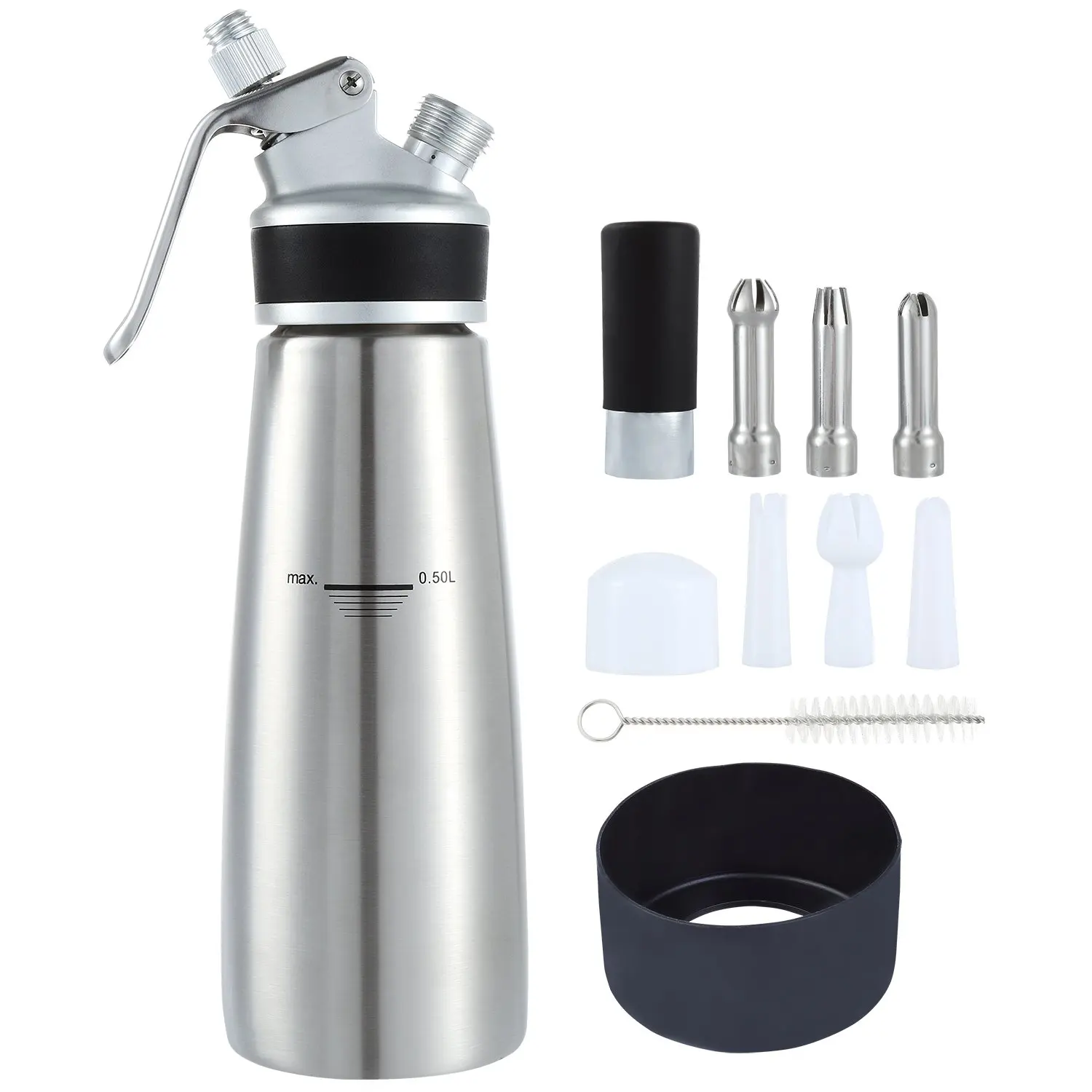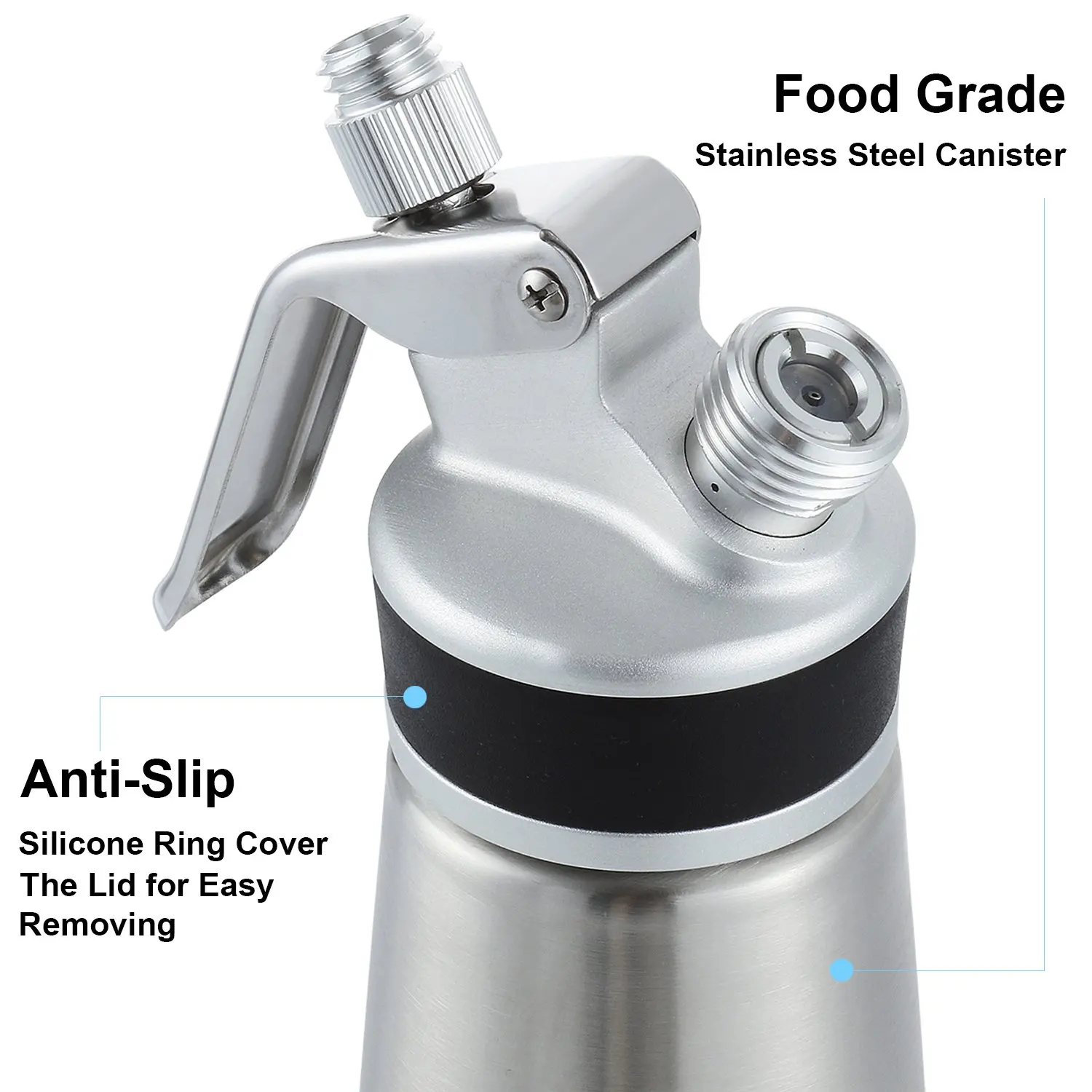 ✅Пищевая нержавеющая сталь взбитые сливки канистра-наш дозатор для взбитых сливок изготовлен из нержавеющей стали 304 пищевой, сверхмощный и безопасный. Силиконовое кольцо обведено крышкой для изготовления крема (крышка изготовлена из алюминия, канистра для бутылок из нержавеющей стали), которая не скользит и помогает Вам легче снять крышку после готовых взбитых кремов ✅Силиконовый латунный держатель для картриджа защищает руки-латунный держатель для крема гораздо легче прикручивать/откручивать, чем алюминиевый. Силиконовый слой покрывает Держатель зарядного устройства для крема, который защищает ваши руки от «замерзания» при снятии держателя зарядного устройства сифона после зарядки ✅Совместим со всеми брендами стандартных картриджей 8 г-производитель взбитых сливок совместим со всеми брендами 8G N2O взбитых сливок, включая mosa, isi, ICO, лучший хлыст, хлыст, И т. Д. (N2O крем зарядное устройство не входит в комплект. Примечание: СО2 картриджи не подходят для этого дозатора крема для взбивания) ✅Бесплатный домашний десерт-2 набора декоративных кончиков, которые позволяют различным потокам взбитых сливок. Идеально подходит для украшения домашних пирогов, тортов, вафель и горячих/холодных напитков и т. д. для любого дизайна, который вы хотите создать, ваши десерты и пищевые начинки будут выглядеть так же отлично, как на вкус ✅Содержимое упаковки-1 пинт нержавеющая стальная штыревая антенна диспенсер для крема; 3 насадки для украшения из нержавеющей стали; 3 пластиковые наконечники для долива; 1 латунный держатель для крема с силиконовым покрытием; 1 пластиковая крышка для зарядного устройства; 1 маленькая щетка для уборки для украшения наконечников; 1 Инструкция пользователя