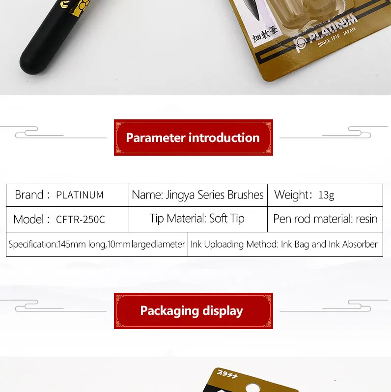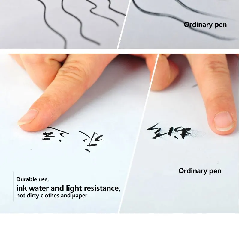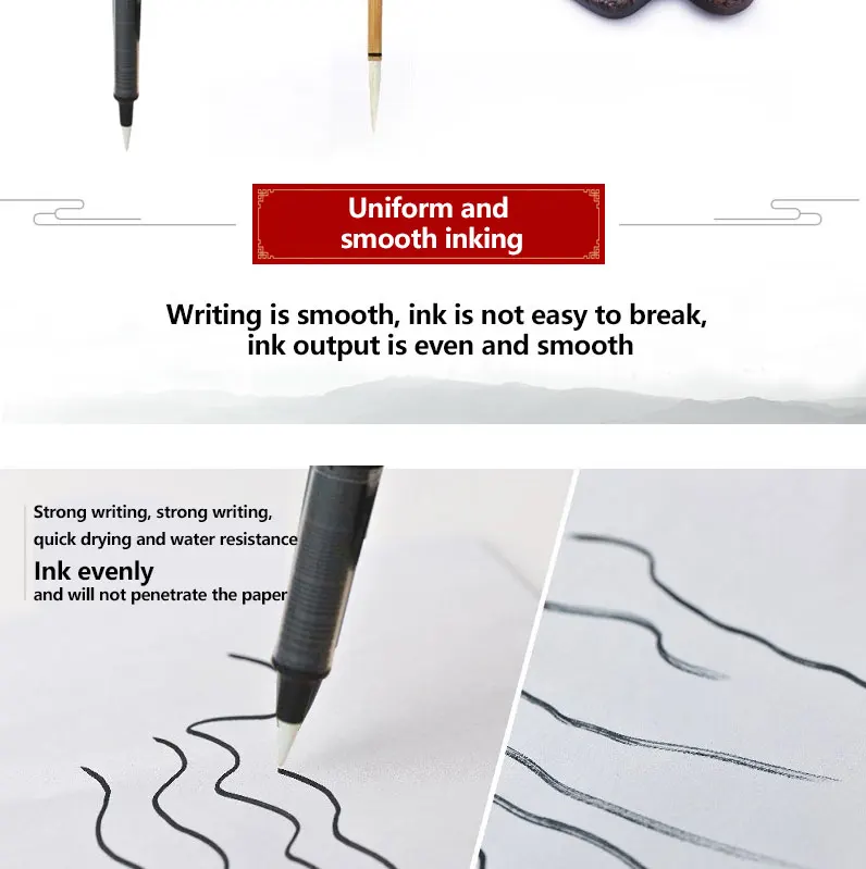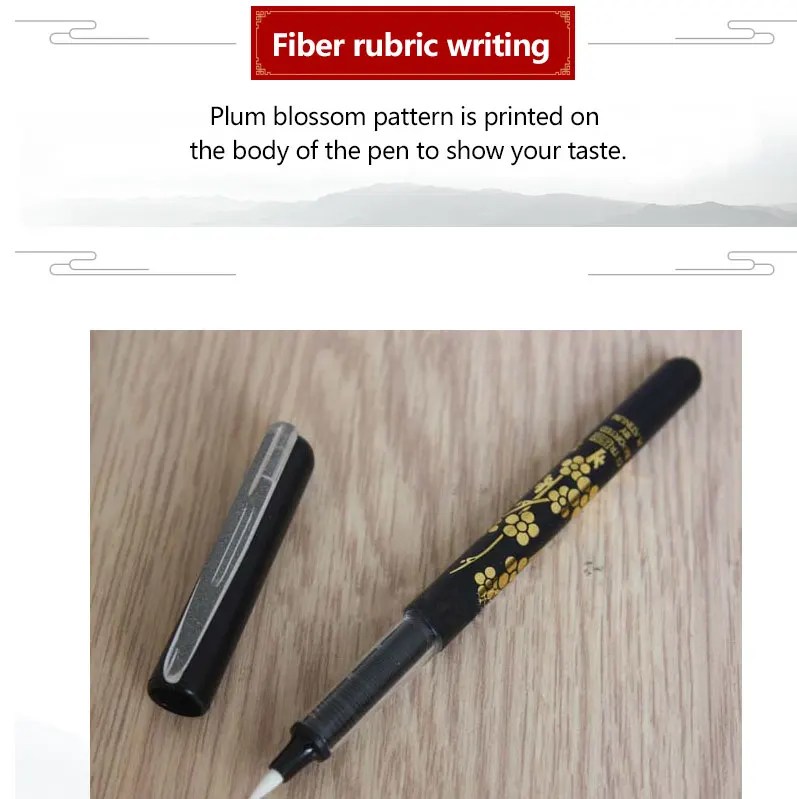 1. Высокая эластичность, тонкая, мягкая и острая 2. Метод ввода: чернильный пакет и чернильный стенд 3. Без шлифовки, лижущей ручки, легко носить с собой. 4. Чернила равномерно и плавно, не легко сломать чернила 5. Устойчивость к воде и светильник Одежда и бумага, прочное использование 6. Рубриковое волокно 7. Тело кисти напечатано с изображением восковой сливы, которая показывает ваш вкус. 8. Материал стержня ручки: смола