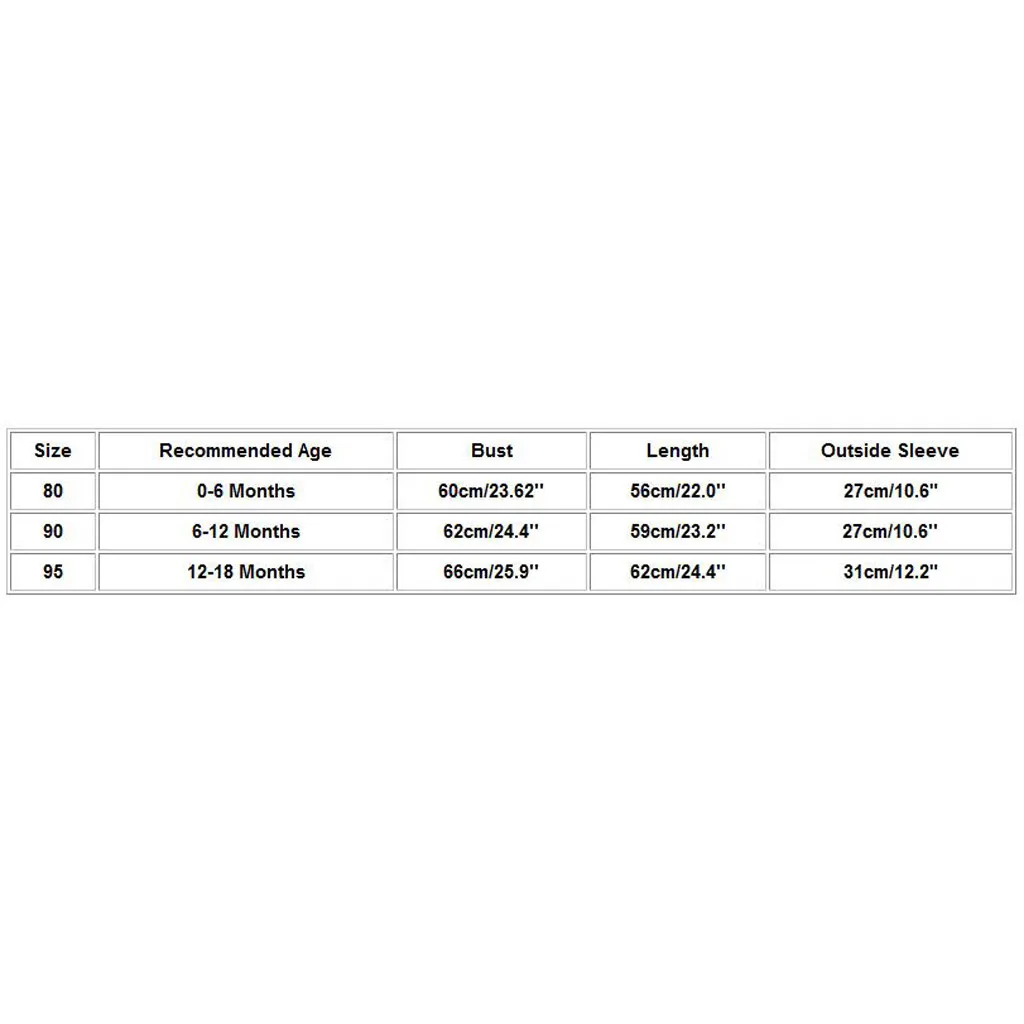 Размеры Рекомендуемый возраст Обхват груди Длина Длина рукава по наружной поверхности 80 Для детей от 0 до 6 месяцев 60 см/23,62'' 56 см/22,0'' 27 см/10,6" 90 6-12 месяцев 62 см/24,4'' 59 см/23,2'' 27 см/10,6'' 95 12-18 месяцев 66 см/25,9'' 62 см/24,4'' 31 см/12,2"