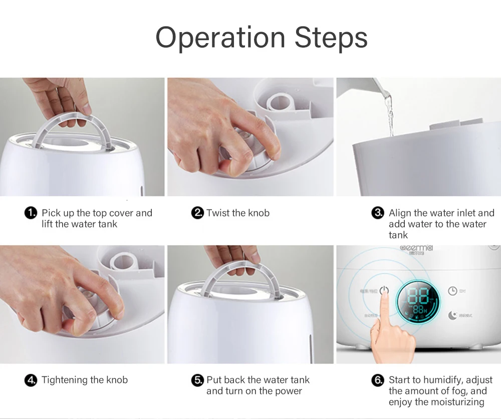 Шесть. Начните увлажнять, отрегулируйте объем тумана, наслаждайтесь увлажнением
