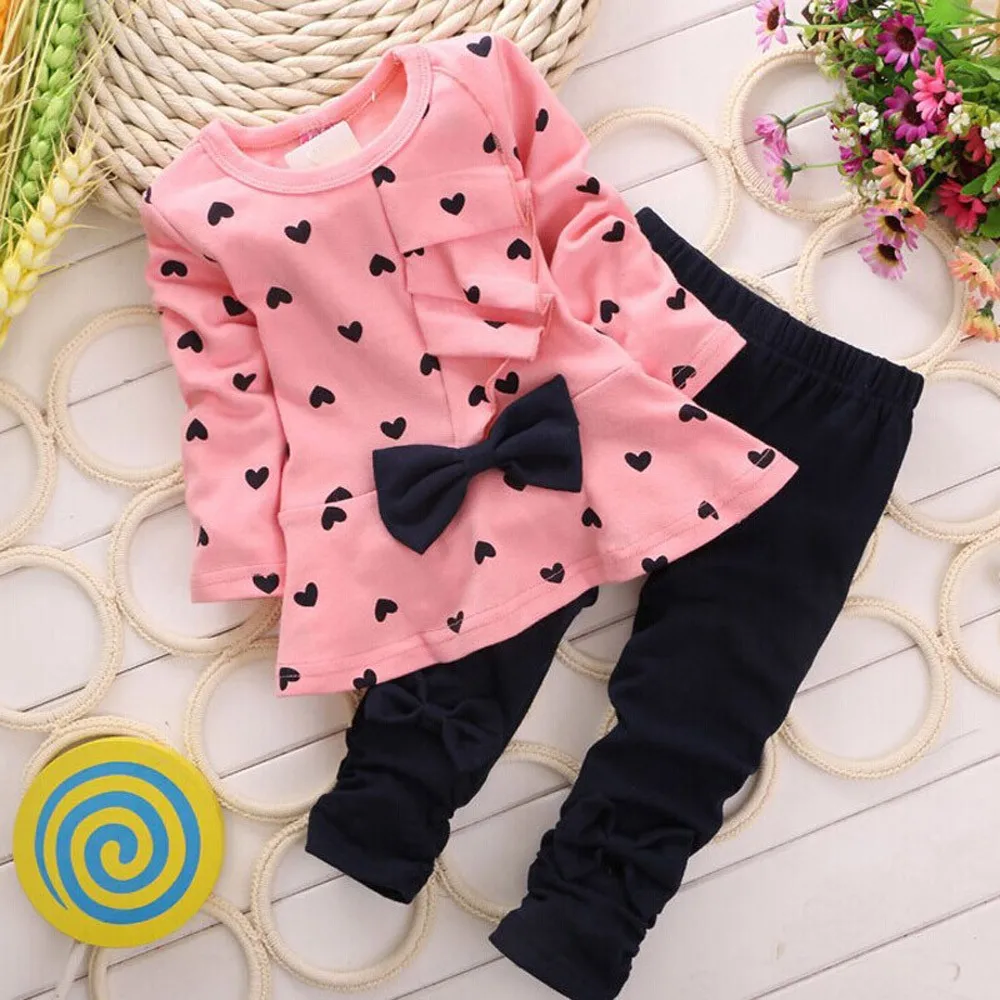 Комплекты с футболкой с бантиком и принтом в форме сердца футболка и штаны для малышей милые комплекты зимней одежды с длинными рукавами для девочек детский ансамбль fille